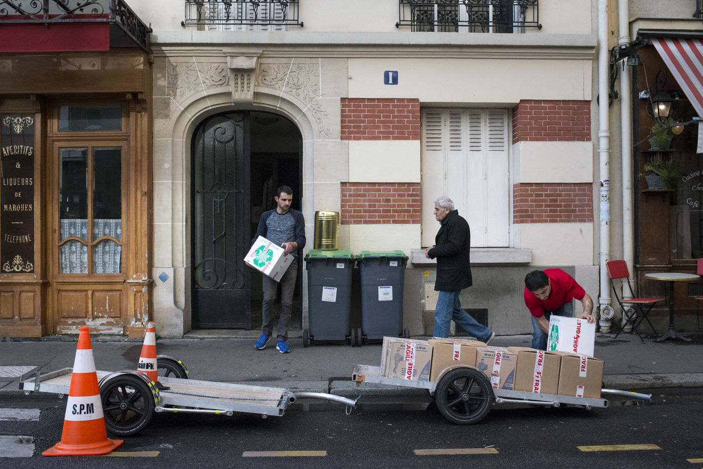Une trentaine de cartons attend ce jour là Ayass et Guillaume, au 4e étage sans ascenseur d'un ancien immeuble du 11e arrondissement. L'équipe semble entrainée, ils descendent les cartons étage par étage pour éviter les charges trop longues, et prennent ensuite le temps qu'il faut pour les placer et bien les sangler sur leur deux vélos électriques à remorques garés devant l'immeuble. Cela terminé, direction le nouvel appart de Fred, 1km plus loin dans le même quartier. Cette fois-ci le déchargement sera plus simple, l'immeuble est récent et cette fois-ci un ascenseur les attend...