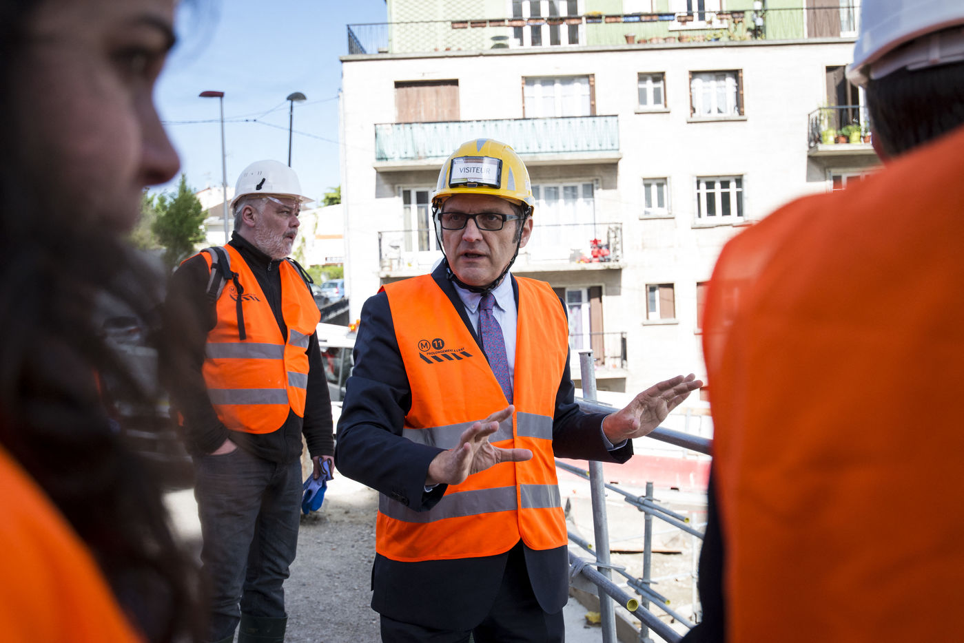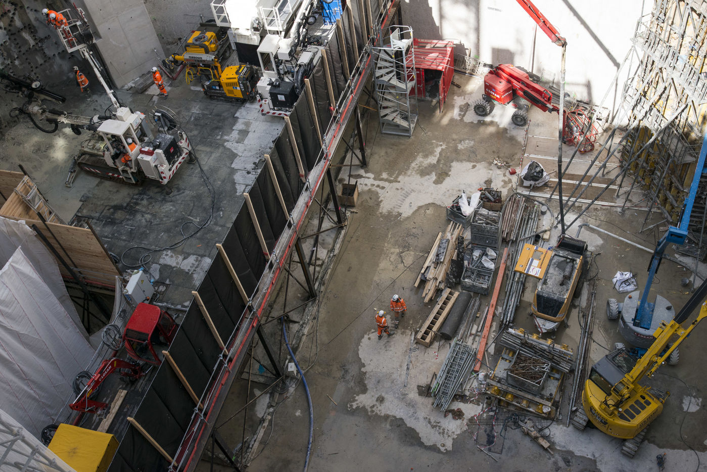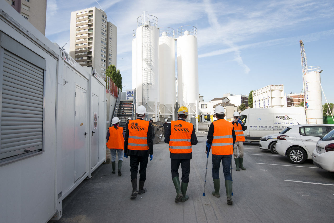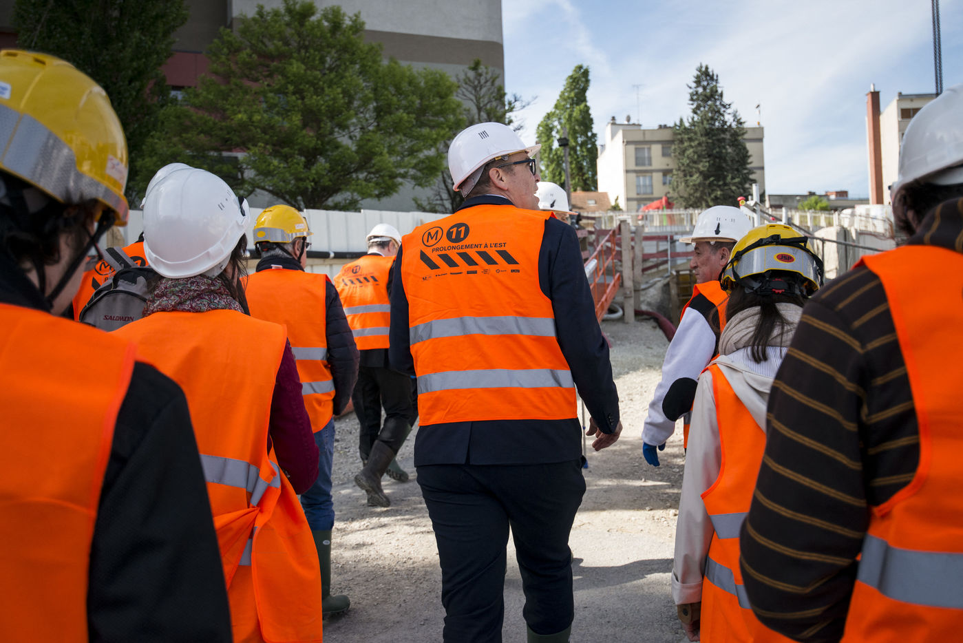 Chantier pour les travaux de la future station La Dhuys à Montreuil, dans le prolongement de la ligne 11 du métro. L'ouverture de la station est prévue pour fin 2022 : Chatelet ne sera plus qu'à 21 minutes contre près d'une heure actuellement. Une visite pour les élus de la ville ainsi q'une vingtaine de riverains a été organisée par la RATP. Vue sur le puit, avant l'arrivée du tunnelier l'année prochaine. Le puit mesure 36 mètres de diamètre, à 25 mètres sous le niveau de la terre. Montreuil, France - le 27 avril 2018.