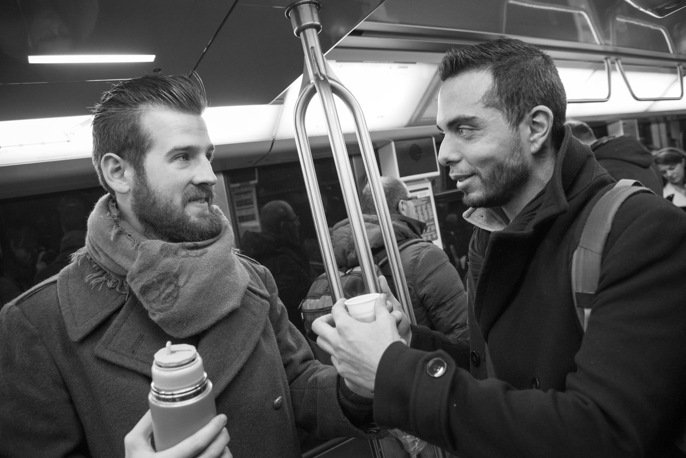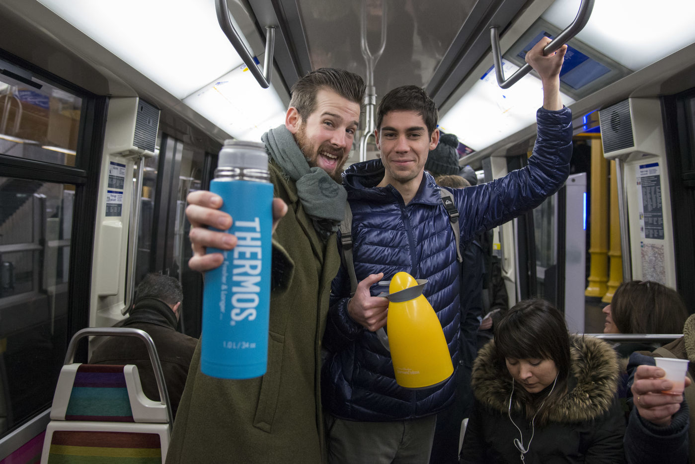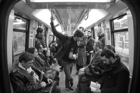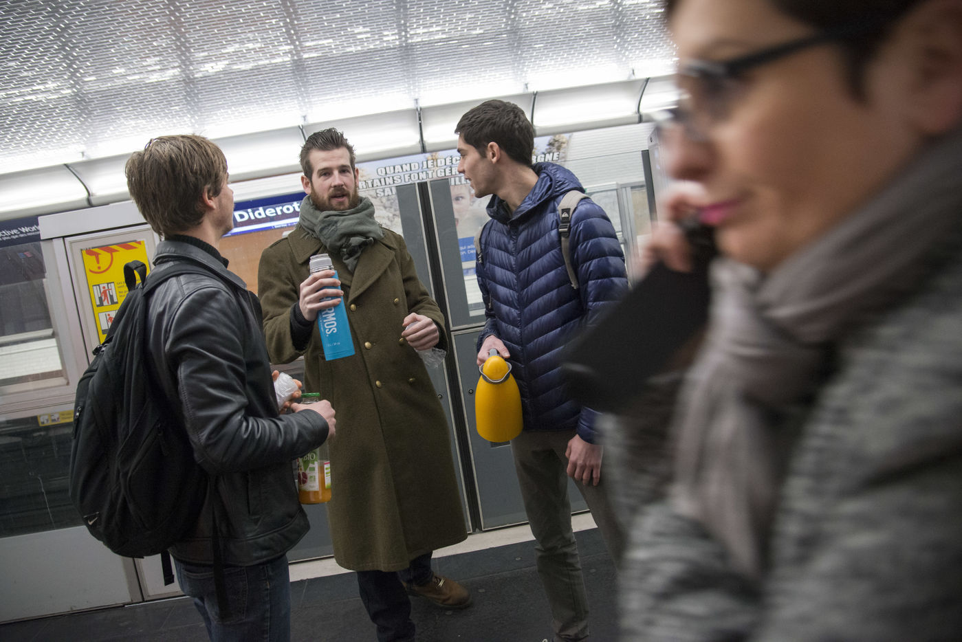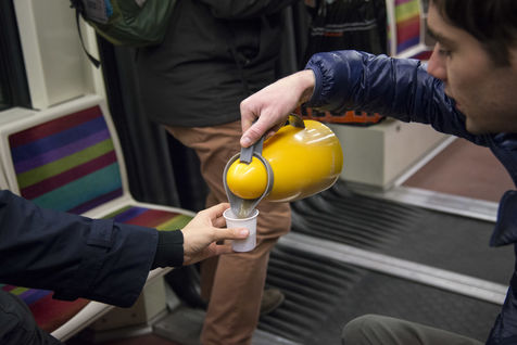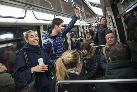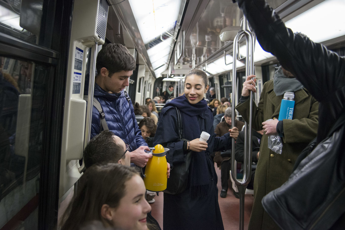 8h30, sur le quai de la ligne 1, quelques jeunes se retrouvent, sourires aux lèvres. Comme tous les lundis matins ils vont distribuer du café, du thé ou des jus aux usagers du métro sur la route du travail avant d'aller eux-mêmes travailler. Cette initiative citoyenne est née de l'envie de faire 'tomber les masques', d'aller à la rencontre des autres, de faire sourire les gens dans le métro et rapprocher les parisiens, en octobre 2015. Leur énergie communicative tout au long de la ligne se ressent, et si certains s'étonnent de cette initiative totalement altruiste, la plupart sont bien contents que leur trajet quotidien s'anime.