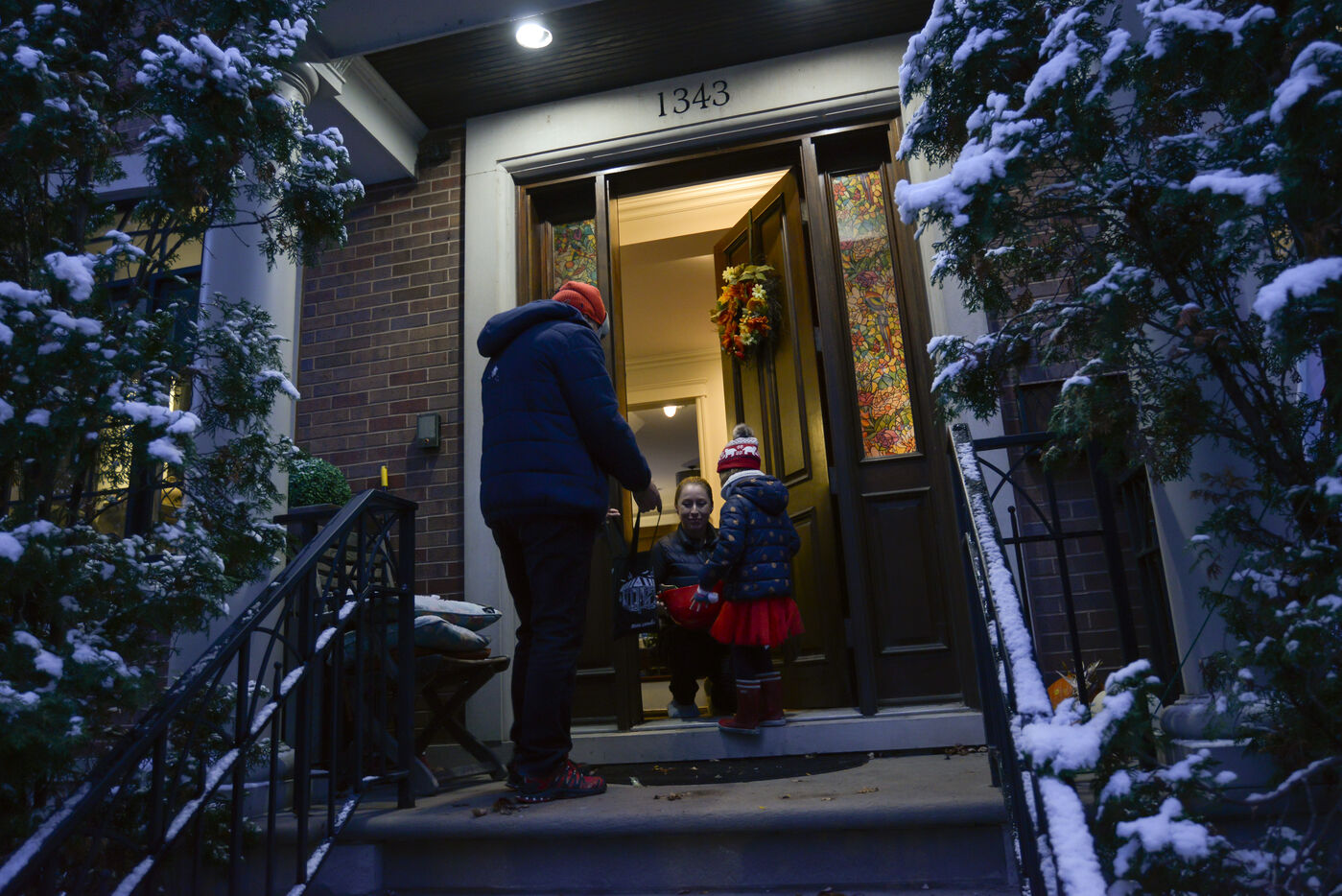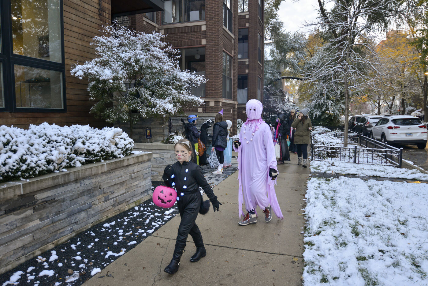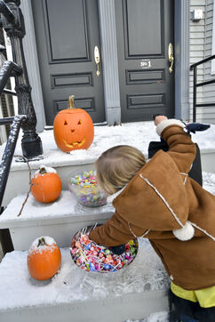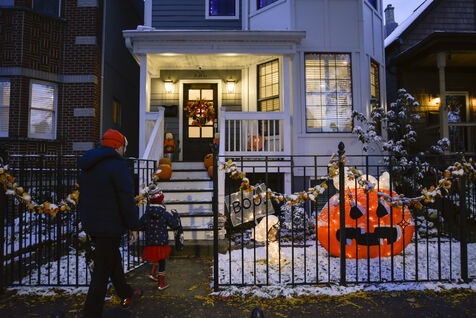 Dès le début du mois d'octobre les décorations sont installées et le soir du 31, les enfants se déguisent et font le tour des maisons pour récolter des bonbons. Cette année il a neigé à Chicago, l'ambiance est hivernale.