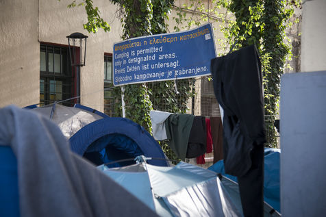 Nous rencontrons Najar, une vieille femme syrienne, qui tente de rejoindre son mari et son fils en Allemagne, avec sa belle-fille et son petit fils de six mois. Elle nous présente le seul document officiel qu'elle possède, récupéré lors de son arrivée en Grèce. Elle a fuit la Syrie en guerre et sa ville Deir Ez-Zor, abandonné leur boutique pour faire la route, malgré son asthme et les difficultés liées à son âge. Elle vient de récupérer son petit-déjeuner lors d'une distribution : un oeuf, une tomate, une bouteille d'eau, une orange, un petit pain. Il lui aura fallu une heure pour le récupérer. Une heure d'attente, alignés les uns derrière les autres, à piétiner le sol. L'attente est continue dans les camps. Différentes distributions se mettent en place et chaque réfugié pourrait passer ses journées dans les files d'attente, pour récupérer un repas, une paire de chaussures pour les enfants, voir un médecin, attendre, attendre, attendre. La journée, Najar partage une grande tente avec sa belle-fille, un autre jeune couple et Yassine. Comme un salon improvisé. Yassine est un ancien fermier syrien. Il cherche à rejoindre Stuttgart où une partie de sa famille vie désormais. Il nous invite à prendre le café, toujours une cigarette à la main.