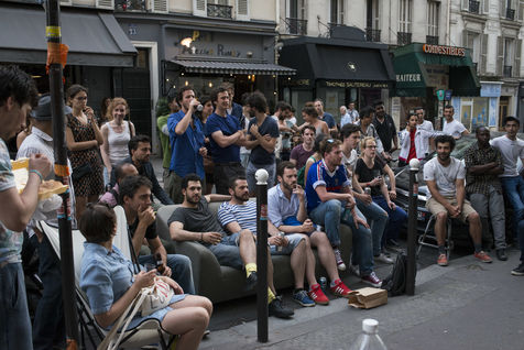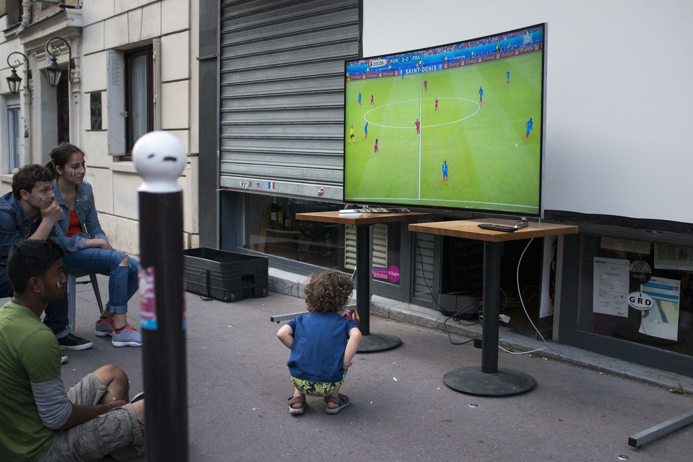 Finale de l'Euro dans la rue Ramey dans le 18e arrondissement de Paris. Des commerçants ont installé un écran sur le trottoir. De nombreux riverains se sont retrouvés pour ce match décisif entre la France et le Portugal. Finalement le Portugal gagnera 1-0 pendant les prolongations.