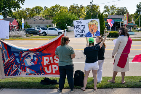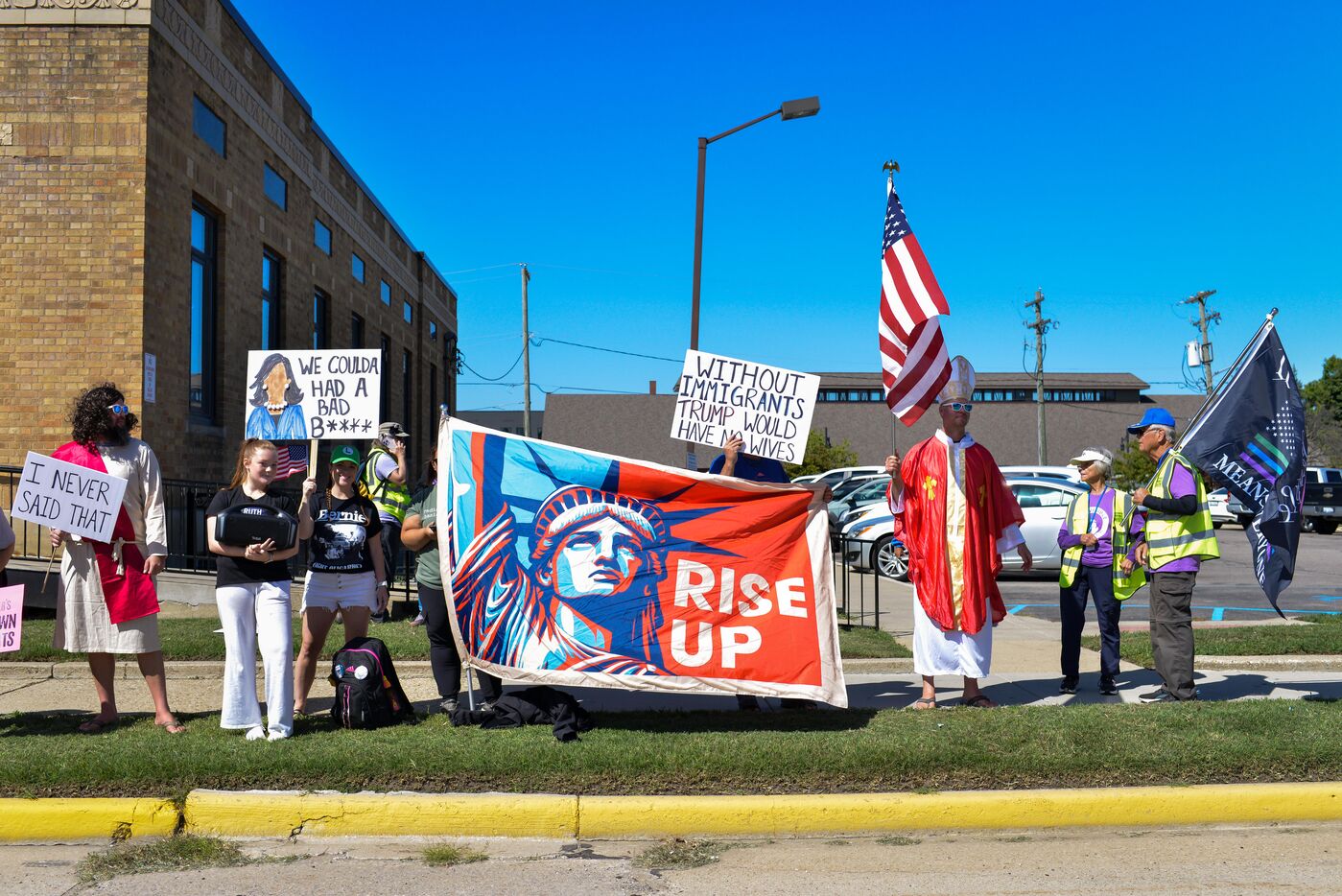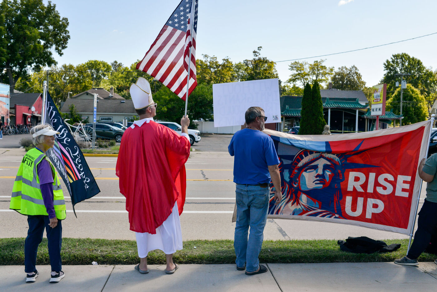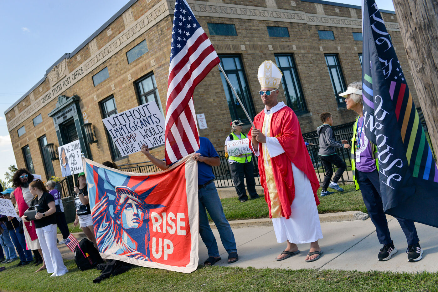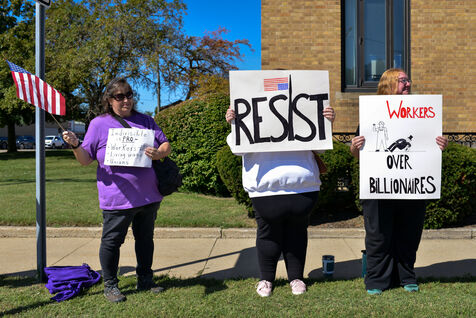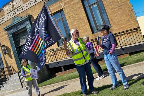 États-Unis, South Haven, Illinois, 2025-08-30. Plusieurs citoyens américains se sont rassemblés devant le bureau de poste de South Haven pour protester contre la politique de Donald Trump, notamment concernant ses choix et actions en matière d'immigration. Il s'agissait d'une manifestation pacifique et immobile dans cette ville balnéaire au bord du lac Michigan. De nombreuses voitures klaxonnaient à leur passage pour montrer leur soutien aux manifestants.