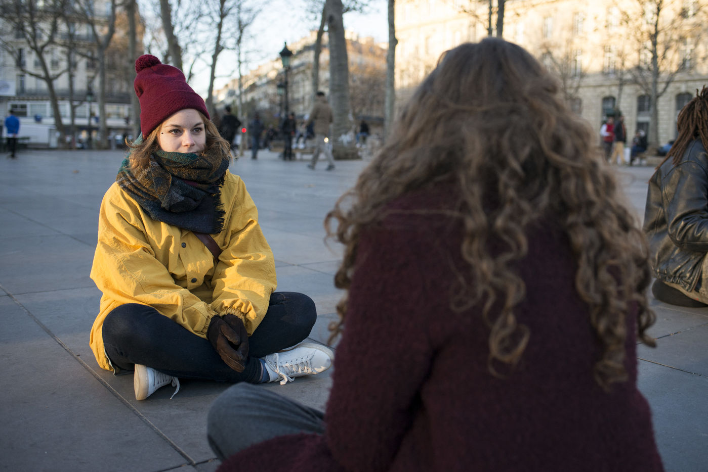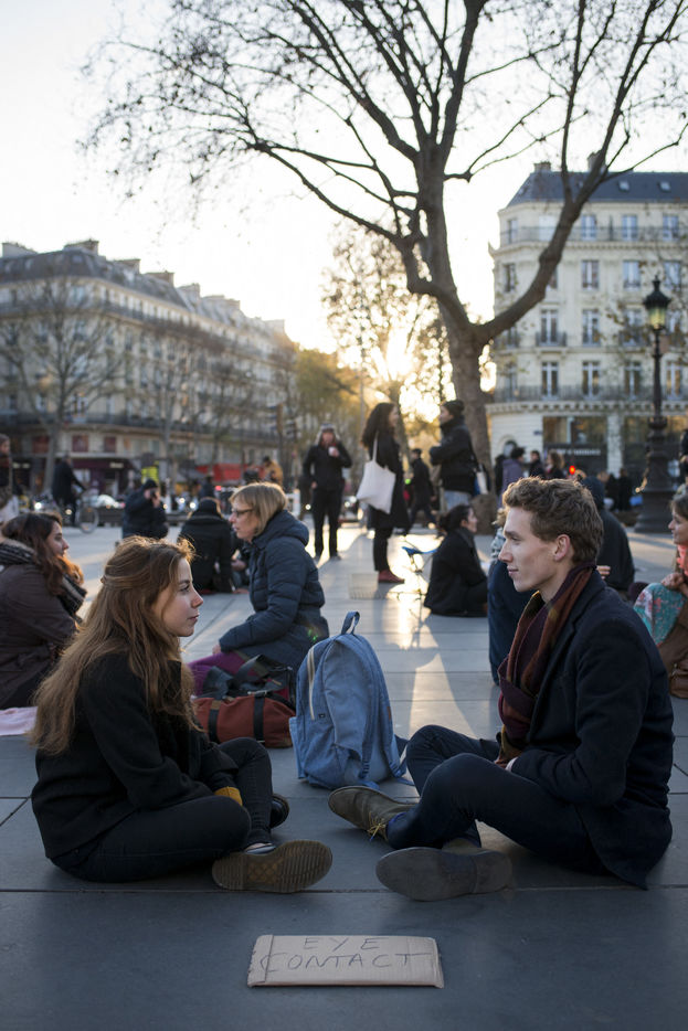 Evènement « Eye Contact » sur la place de la République, une expérience visuelle. Cela consiste à regarder dans les yeux un inconnu, généralement, avec qui vous êtes face à face, et se rencontrer par le regard durant au moins une minute. Echanger sans parler, partager ses émotions avec ses yeux. Paris, France ? 3 décembre 2016.