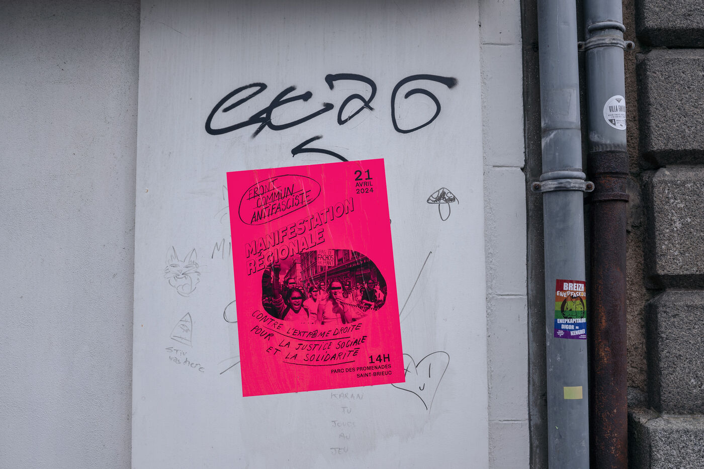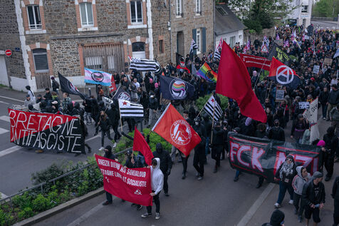 Manifestation régionale à Saint-Bireuc (Côtes-d'Armor) contre l'extrême-droite. Ce 21 avril 2024, 22 ans après l'accession de Jean-Marie Le Pen au second tour des élections présidentielles, plus de 80 associations, collectifs, syndicats et partis politiques ont appelé à prendre la rue pour combattre le fascisme.