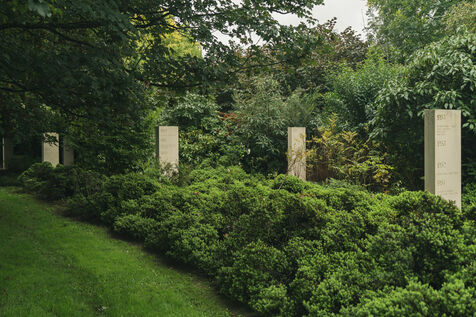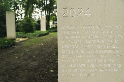 A memorial site dedicated to war reporters and press freedom. More than 2,000 names of journalists killed around the world since 1944 are engraved on white steles. This year, an olive tree was planted in homage to the Palestinian journalists killed in Gaza.