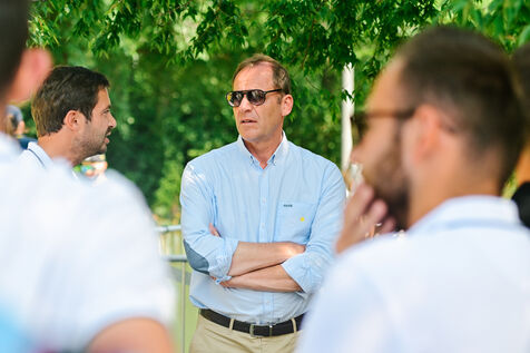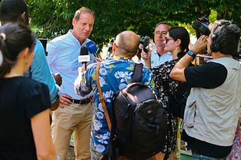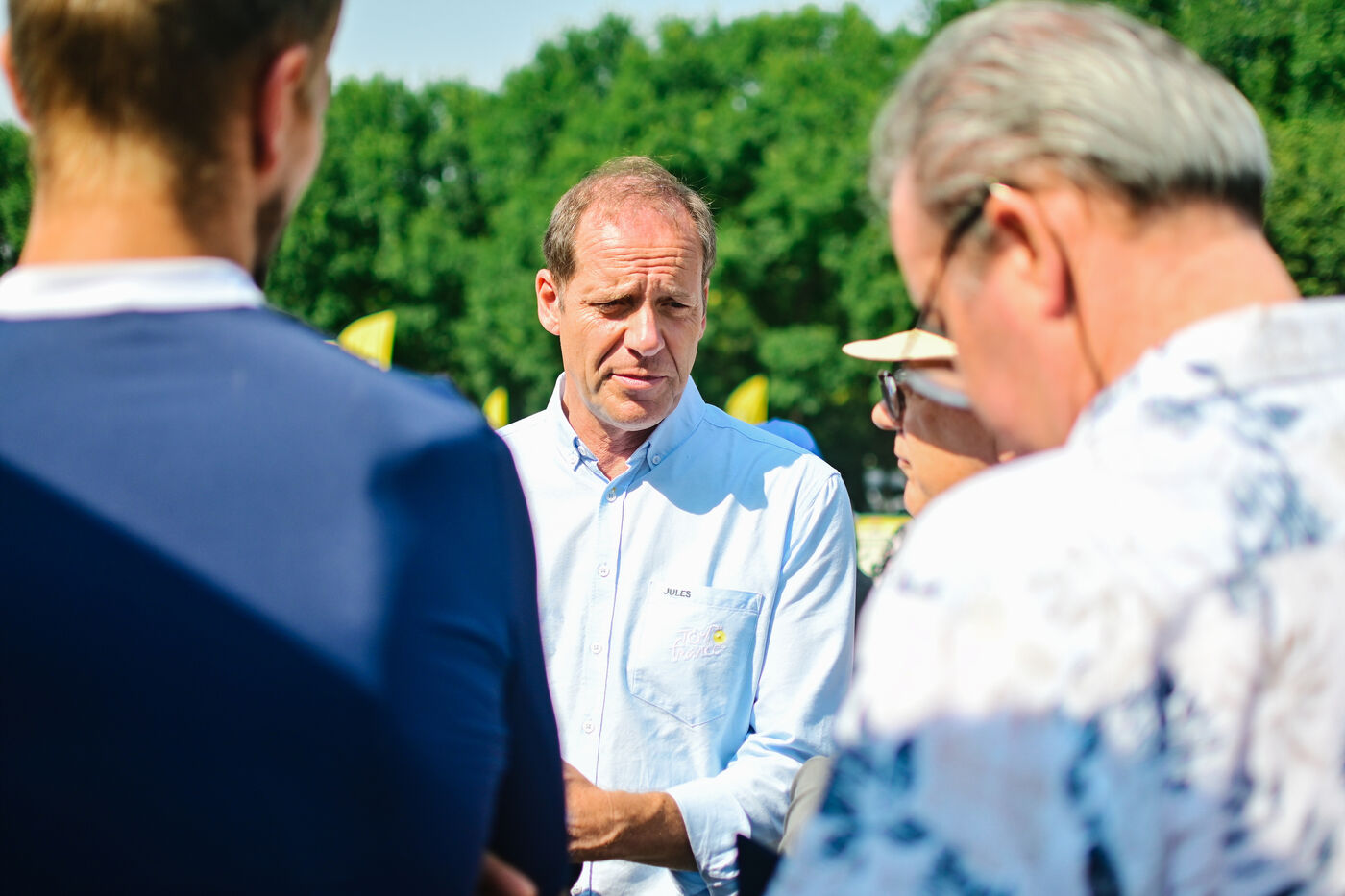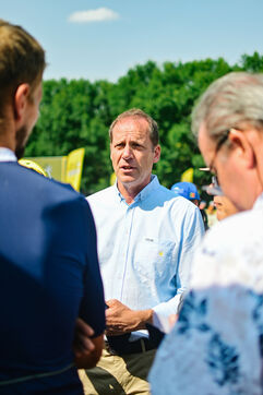 France, Clermont-Ferrand, 2023-07-10. Inauguration officielle du Fan Park de Clermont-Ferrand, situe place du 1er Mai, par Christian Prudhomme, directeur du Tour de France depuis 2007, Olivier Bianchi, maire de la ville et Philippe Chopin, Prefet du departement du Puy-de-Dome. Pendant le Tour de France, Clermont-Ferrand est l une des quatre villes a accueillir un Fan Park. Photographie par Adrien Fillon / Hans Lucas.
