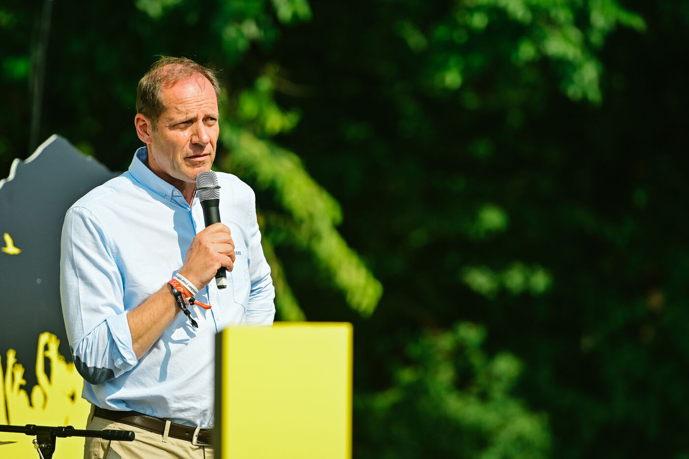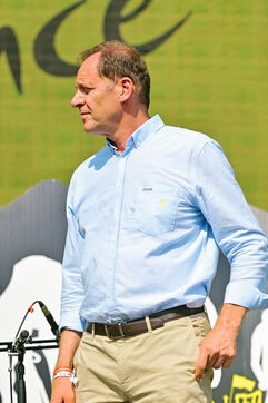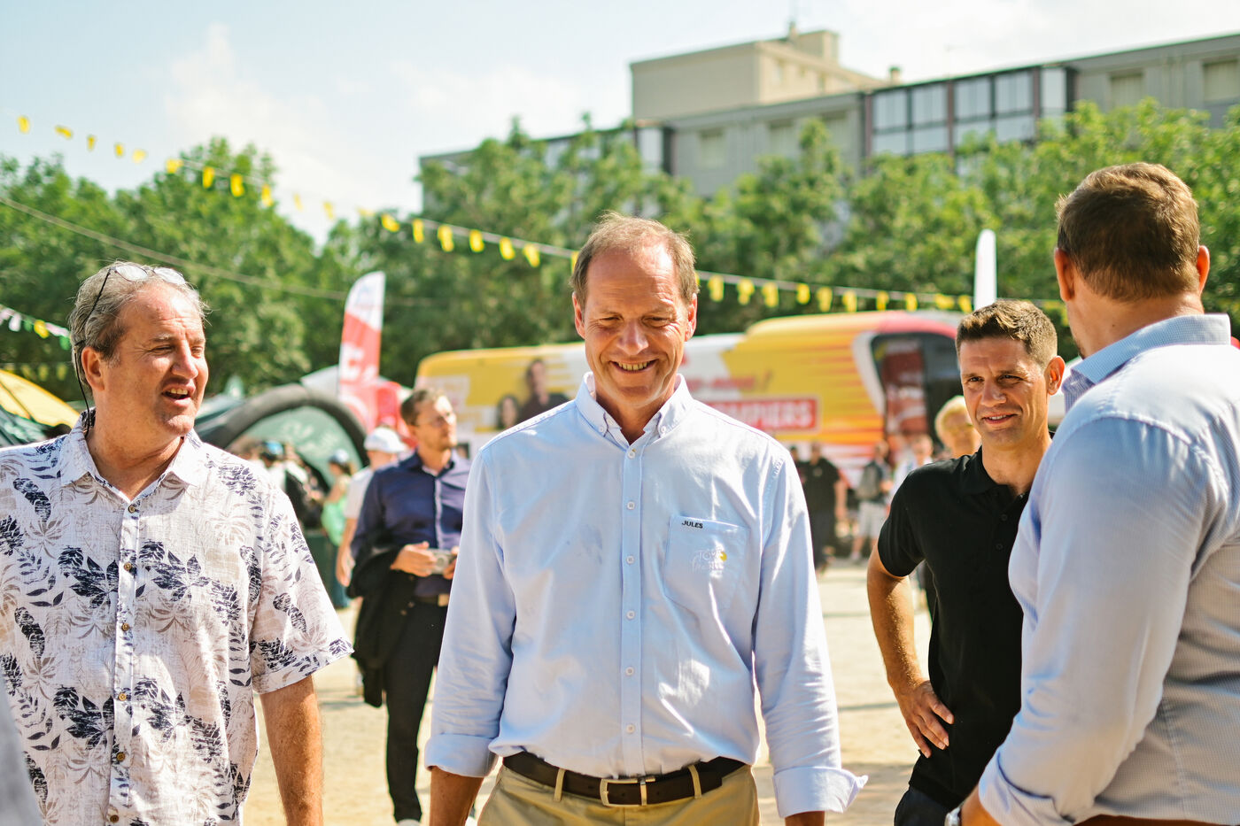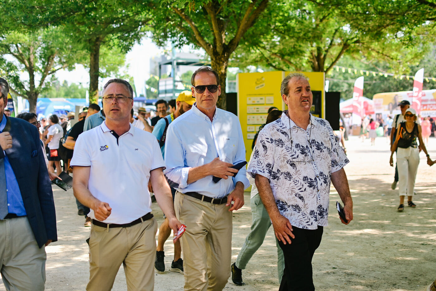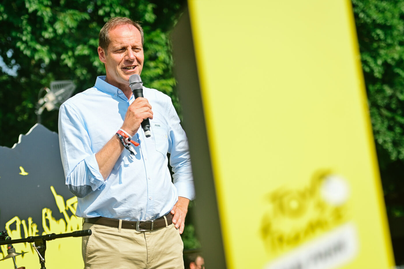 France, Clermont-Ferrand, 2023-07-10. Official opening of Clermont-Ferrand s Fan Park on the place du 1er Mai by Christian Prudhomme, general director of the Tour de France since 2007, Olivier Bianchi, Mayor of the city and Philippe Chopin, Prefect of the Puy-de-Dome department. For this 2023 Tour de France, Clermont-Ferrand is one of the four cities that welcome a Fan Park. Photograph by Adrien Fillon / Hans Lucas.