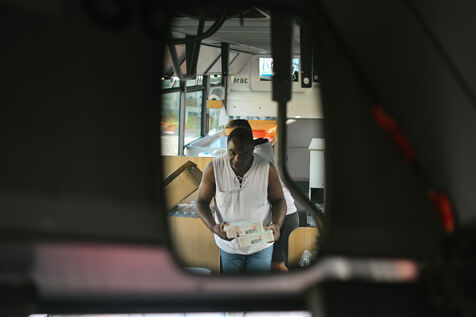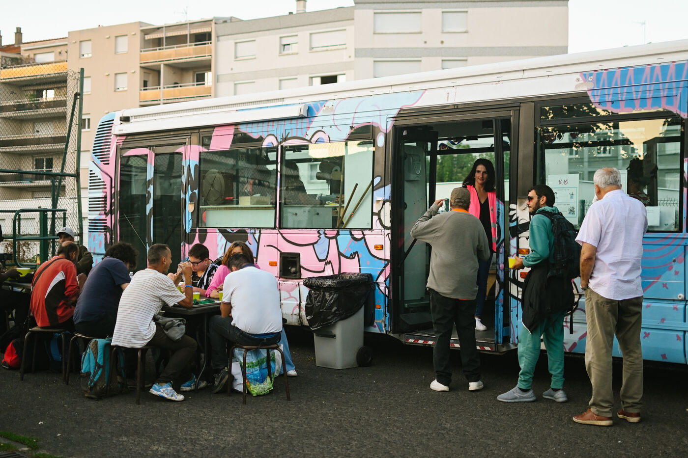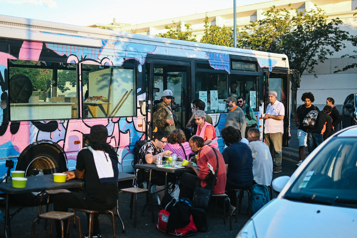 Every Tuesday evening during the summer months, a handful of volunteers from the Clermont-Ferrand branch of Restos du Coeur climb aboard the "Bus du Coeur". Filled with provisions, ready-made meals, blankets and bags, the bus makes its first stop in the north of Clermont-Ferrand, in the Fontgiève district. As soon as the tables are set up outside, the beneficiaries, smiles on their faces, sit down and share their meal. Here, the homeless mingle with those in financial difficulty (most live on RSA).