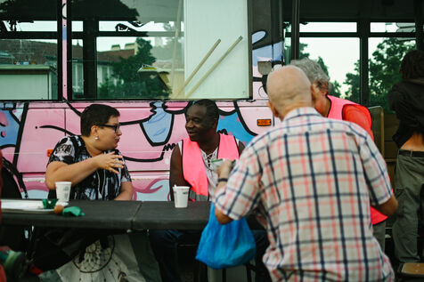 Chaque mardi soir, en période estivale, une poignée de bénévoles de la section clermontoise des Restos du coeur montent à bord du "Bus du coeur". Rempli de provisions, plats préparés, couvertures, sacs, le bus prend la direction du nord de Clermont-Ferrand, dans le quartier Fontgiève, pour un premier arrêt. A peine les tables installées en extérieur, les bénéficiaires, sourires aux lèvres, s'y installent et partagent leur repas. Là, les sans-abris se mêlent aux personnes en difficulté financière (la plupart vivent avec le RSA).