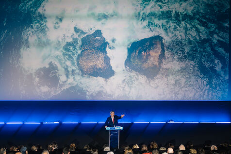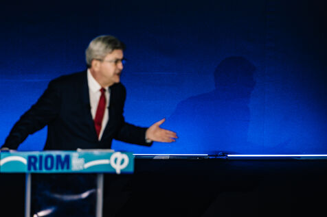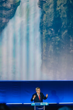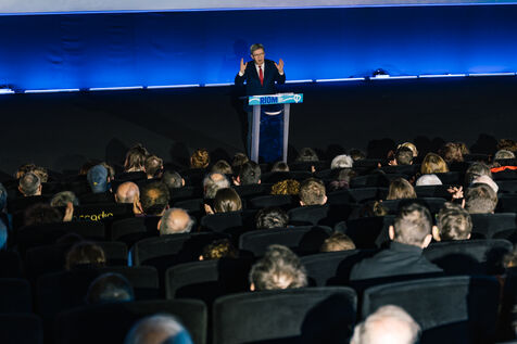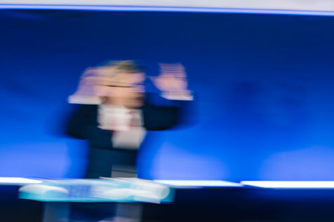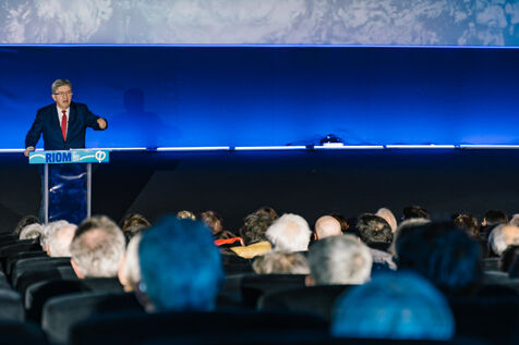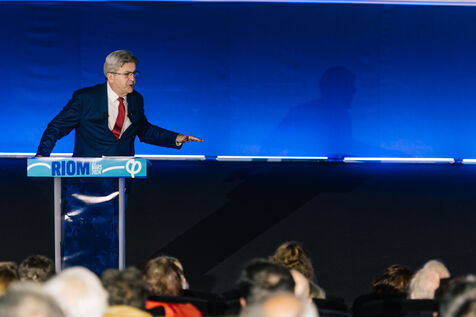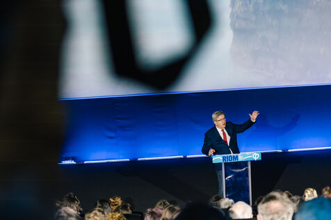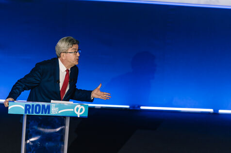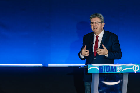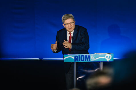 France, Riom, 2024-03-22. French left-wing party La France Insoumise (LFI) leader Jean-Luc Melenchon, and LFI MP for Puy-de-Dome department, Marianne Maximi, hold a meeting in Riom, Auvergne, near Clermont-Ferrand, on the occasion of World Water Day. Photograph by Adrien Fillon / Hans Lucas.