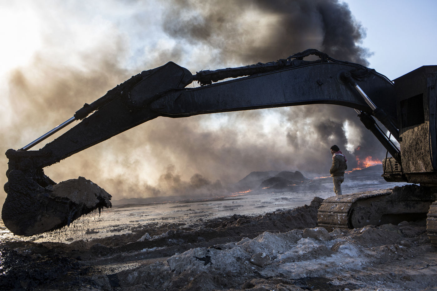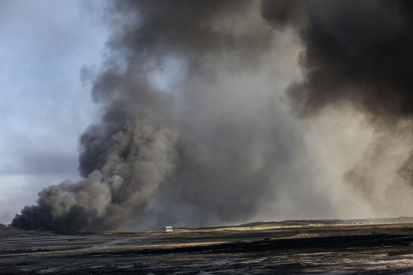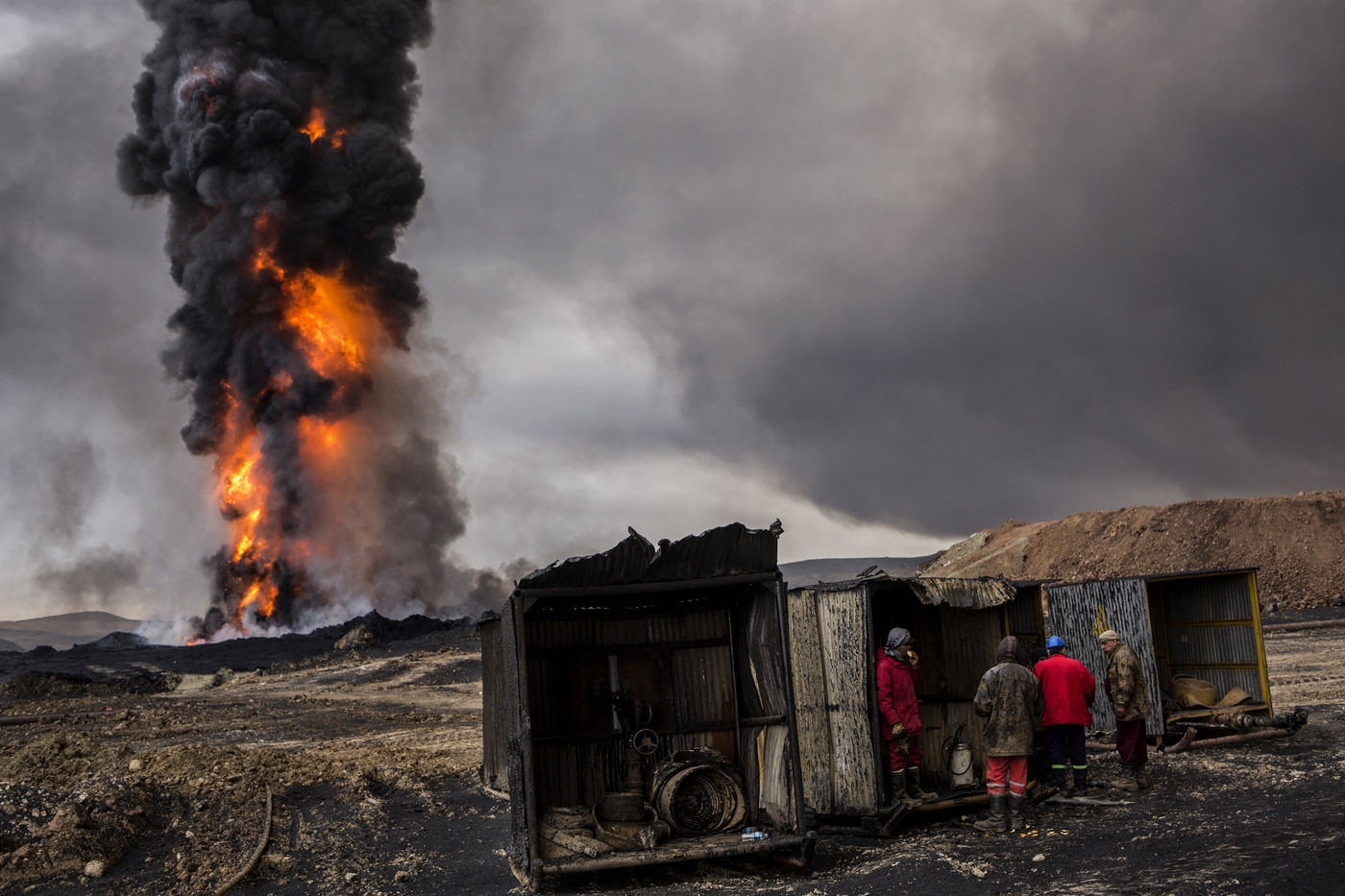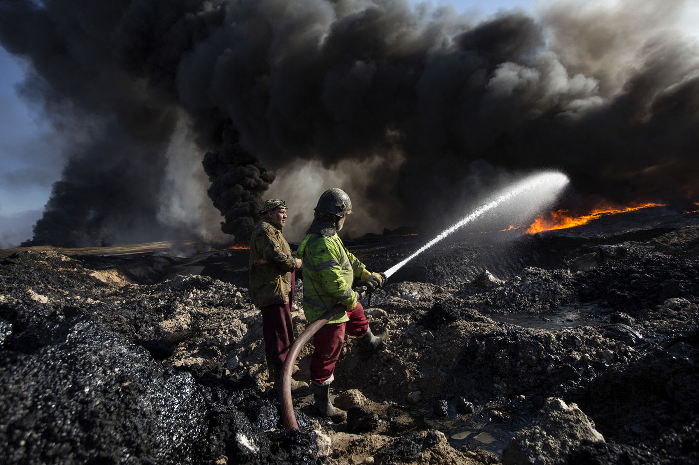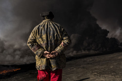 Dans leur fuite en août 2016, les hommes de Daesh ont incendié plus de vingt puits de pétrole dans la région d'Al Qayyarah, ville du Nord de l'Irak située à 70 km au sud de Mossoul. Depuis leur retraite forcée, de hautes colonnes de fumée noire et toxique s'élancent vers le ciel, assombrissant l'horizon.