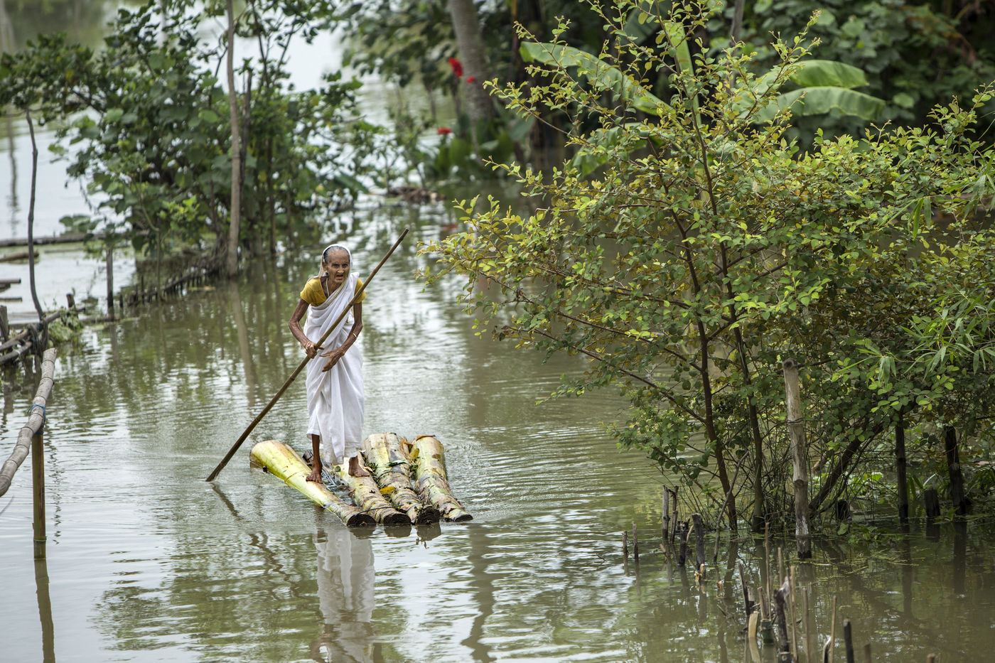 Mais lorsque les pluies diluviennes arrivent, le fleuve nourricier se gonfle, Majuli se retrouve alors submergée, grignotée de toute part. L'eau envahit les terres et détruit les récoltes. Ses rives s'arrachent par pans entiers. Les forts courants empêchent le ferry de traverser et l'île se retrouve privée d'électricité. Chaque année, plusieurs villages sont emportés au fil des crues.