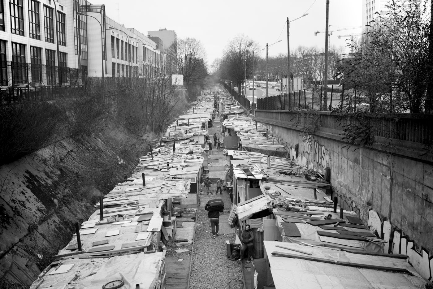 En pleine trêve hivernale, près de 400 personnes se sont vues expulsées du bidonville des Poissonniers sans solution de relogement viable. Le Bidonville situé entre les portes des Poissonniers et Clignancourt était devenu le lieu de vie de près de 400 personnes par moments. Les derniers jours de Pedru, Raluca, Barbra ou encore Dumitru. Février 2016. Paris, Porte des Poissonniers.