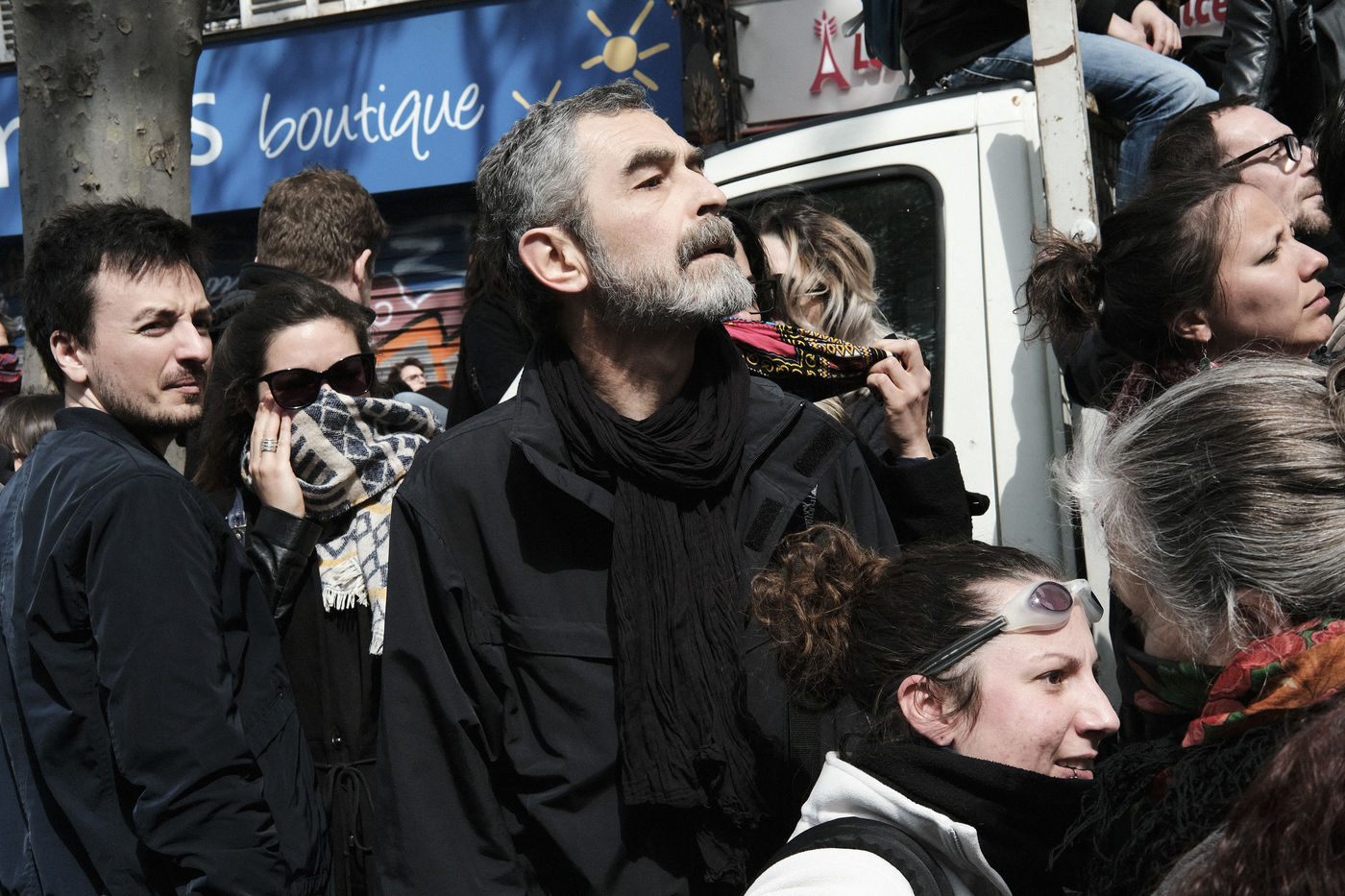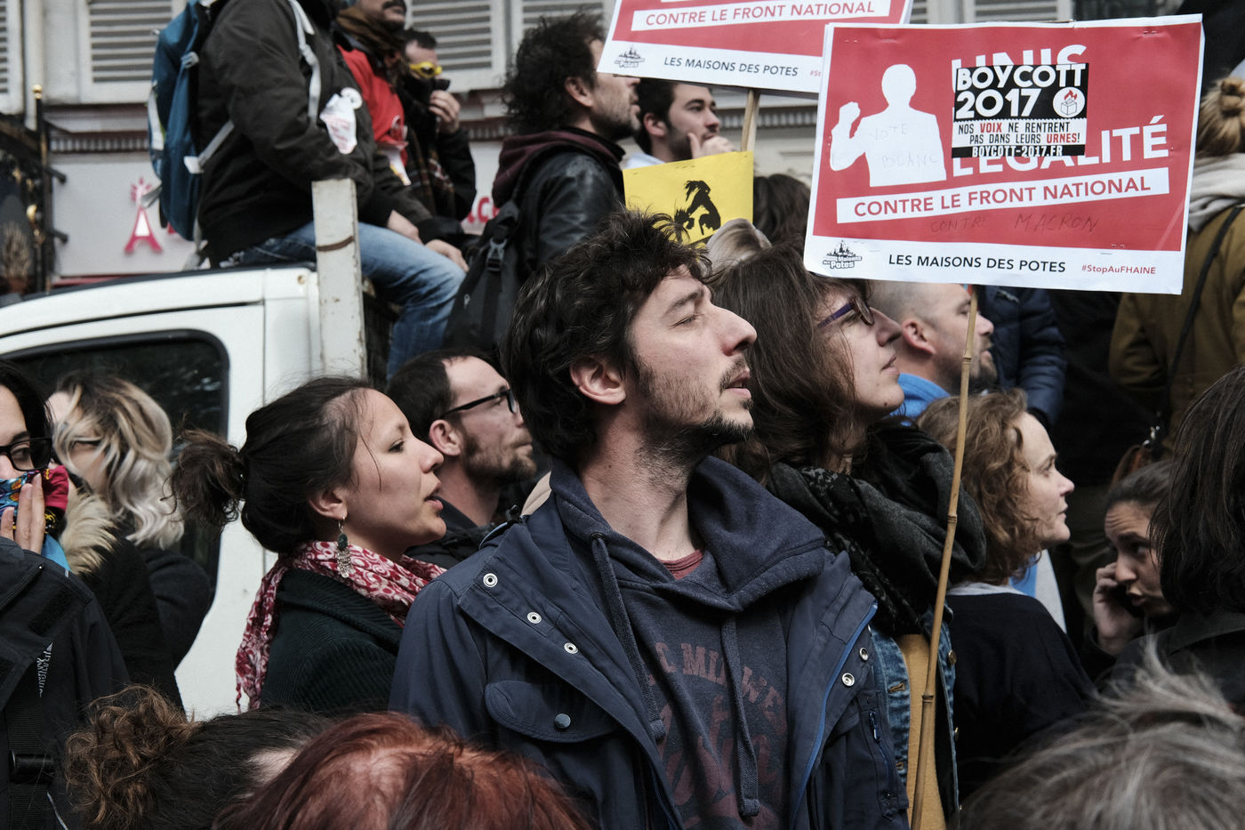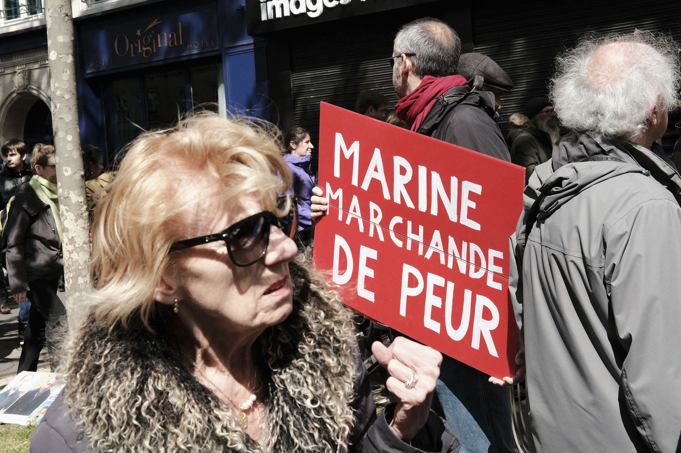 Manifestation du 1er mai entre les deux tours de l'élection présidentielle française de 2017. Les manifestants sont perplexes. Les syndicats appellent à une journée de lutte et de mobilisation pour le progrès social mais n'ont pas défilé ensemble. Pour certains syndicalistes, la présence au second tour du Front National ne doit pas éclipser les revendications sociales dont l'abrogation de la loi Travail. 1er mai 2017. Paris, France.