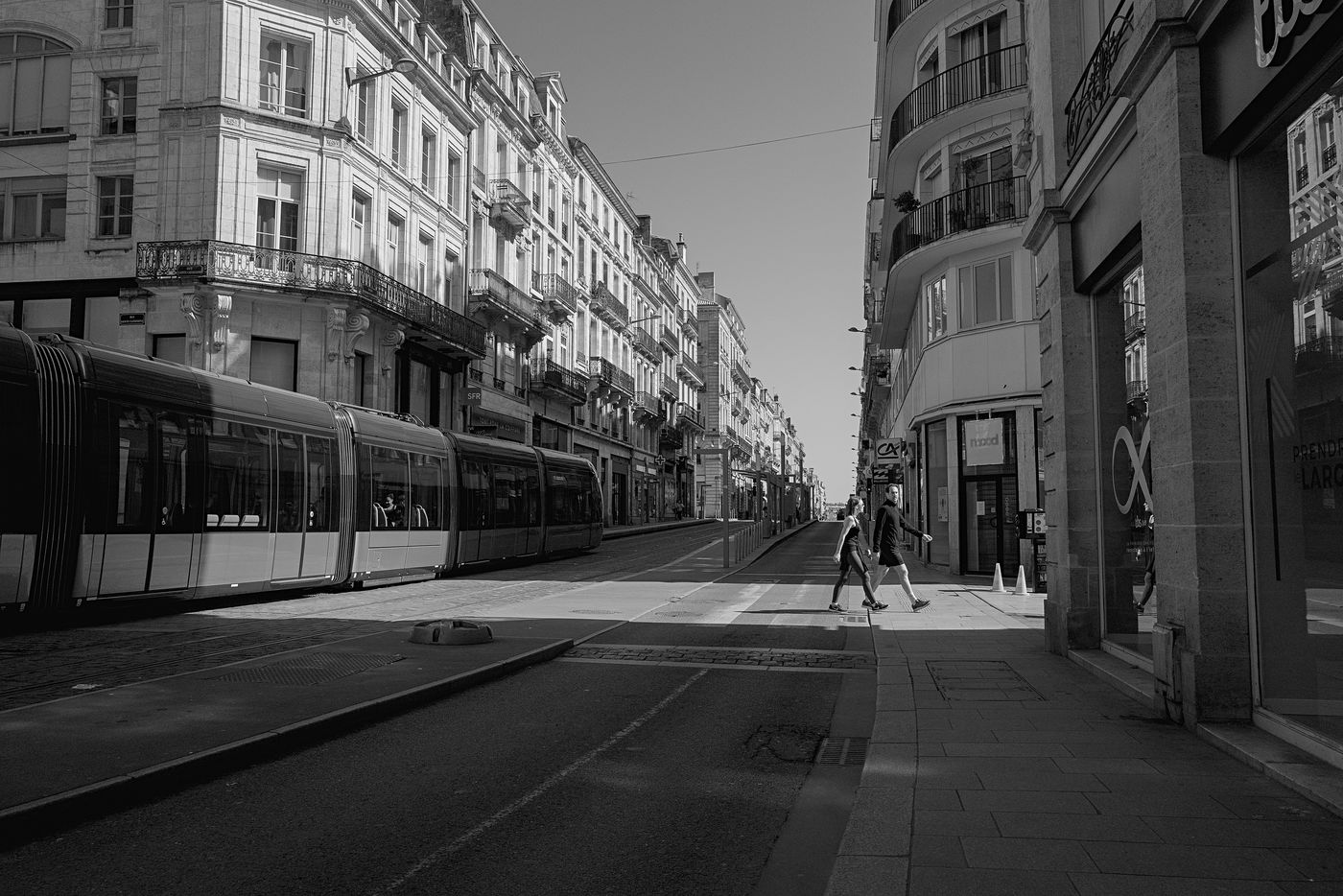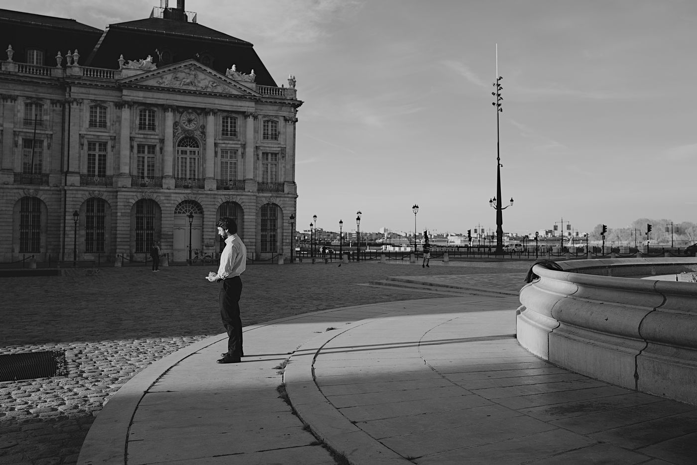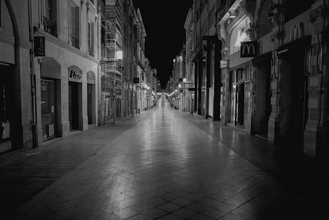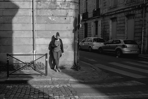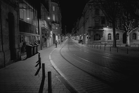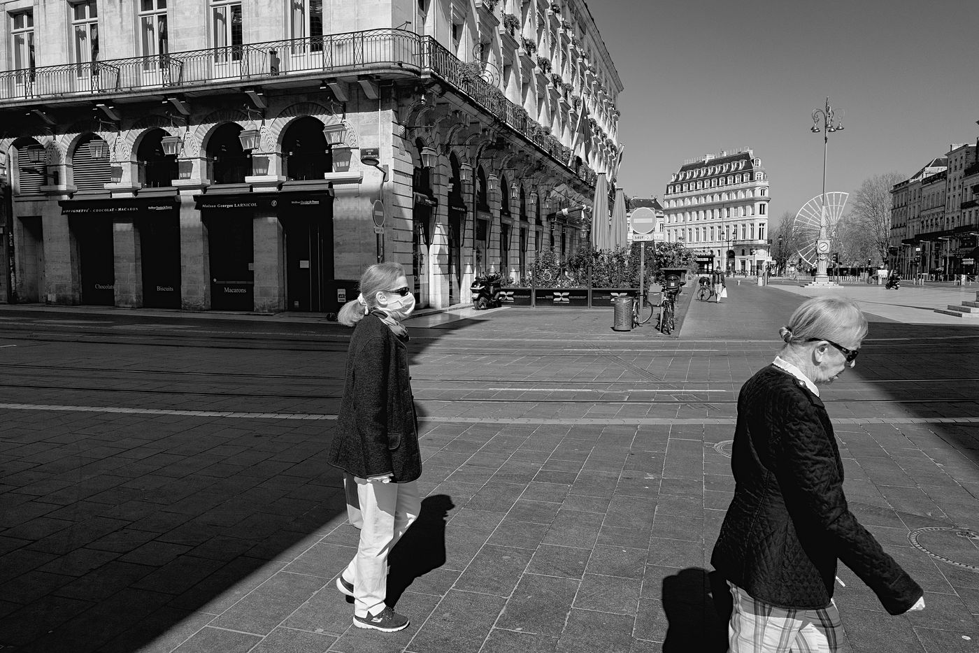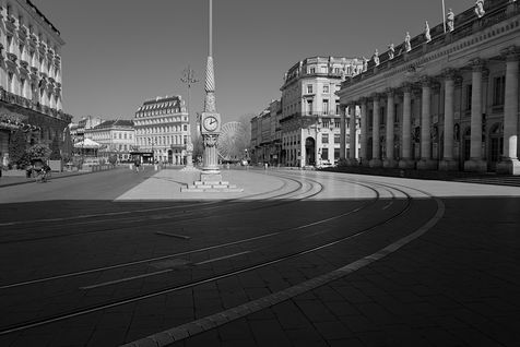 Bordeaux under lockdown. Life is slow. The people of Bordeaux are moving in a depopulated space where space-time is inexorably stretching. The fear of being contaminated sets in. The minimum distance of 1.5 metres between each person to limit contamination with Covid-19 is respected. The fear of the Covid-19, an invisible threat, is accompanied by distrust of the other. March - April 2020.