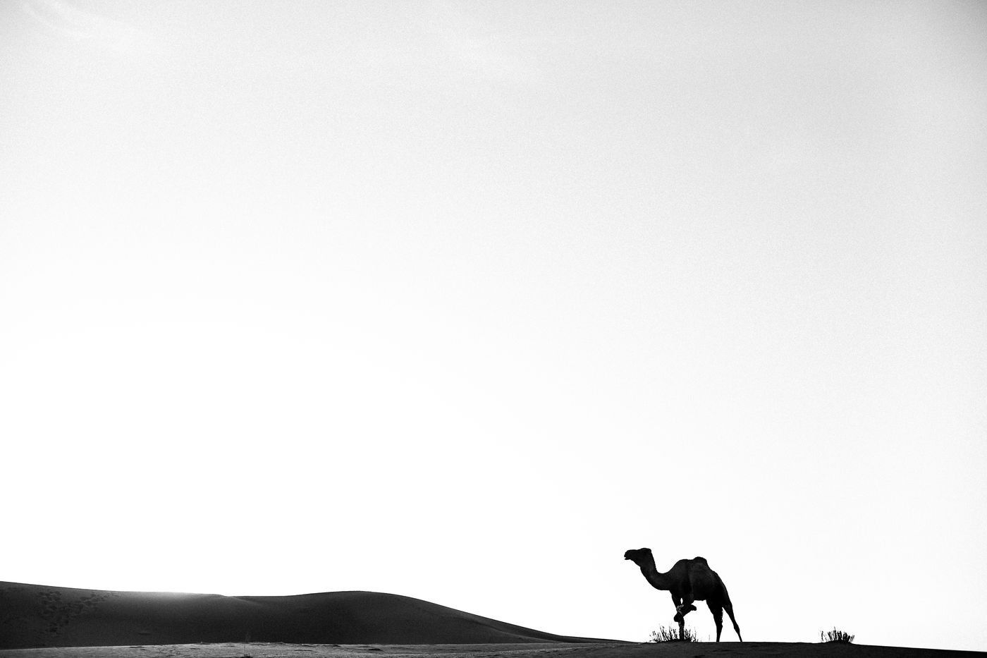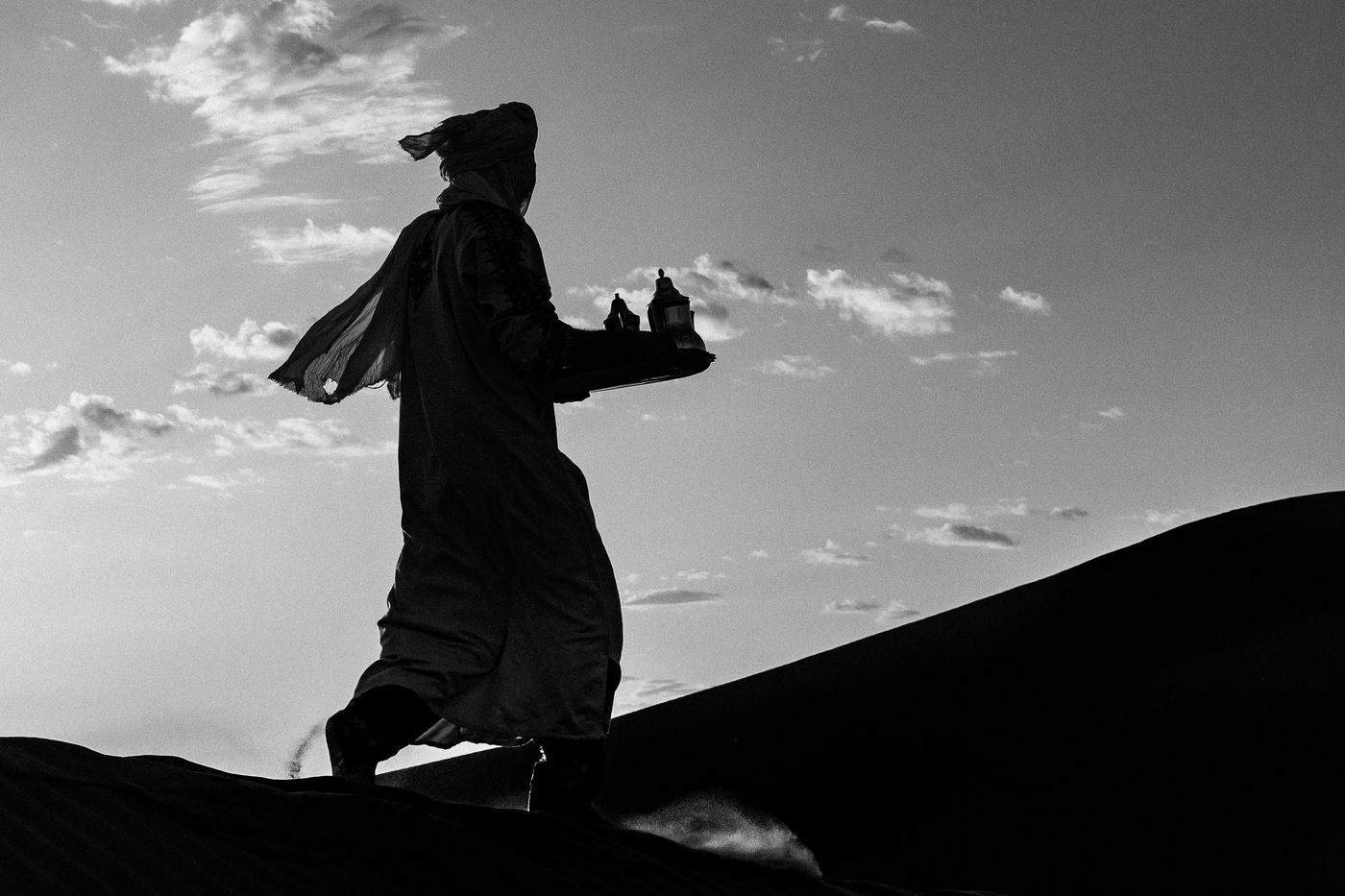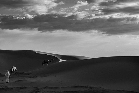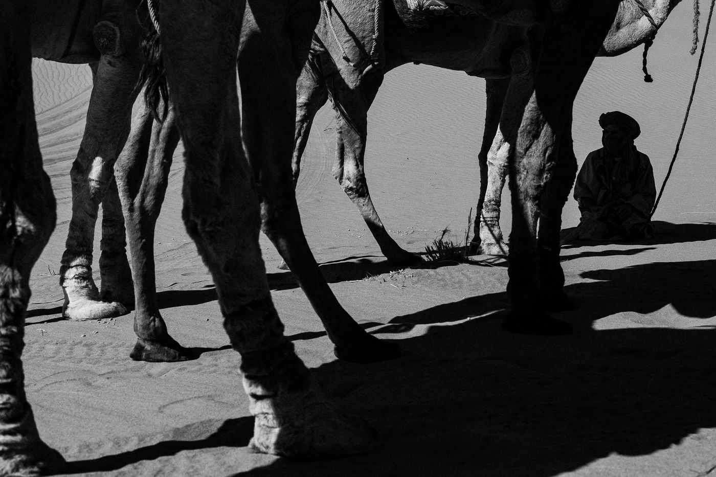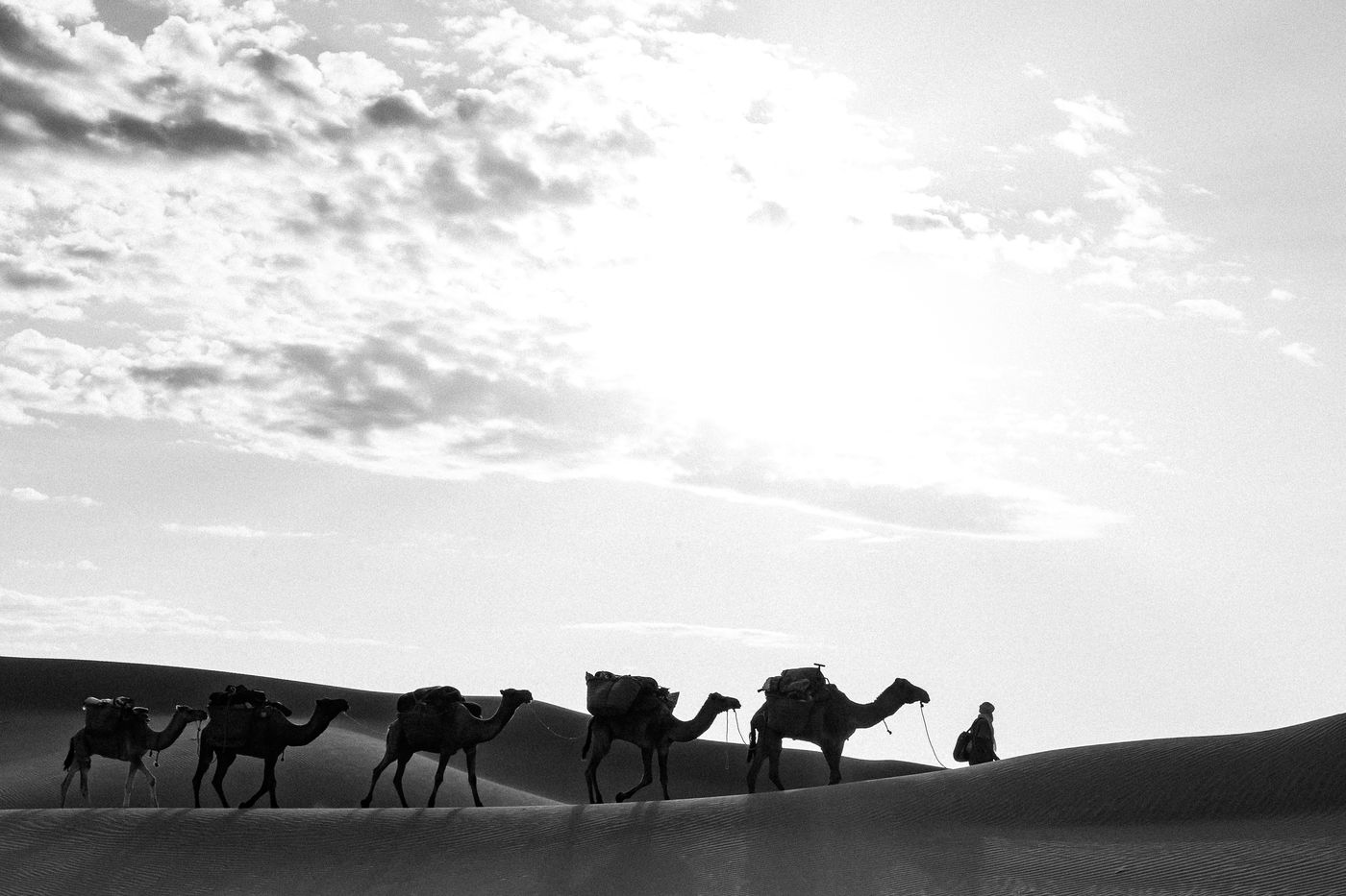 Morocco. Somewhere in the south of Zagora, waves of sand and the sound of silence. At the bend of a dune, dromedaries and Berber men.