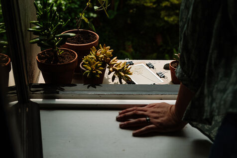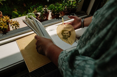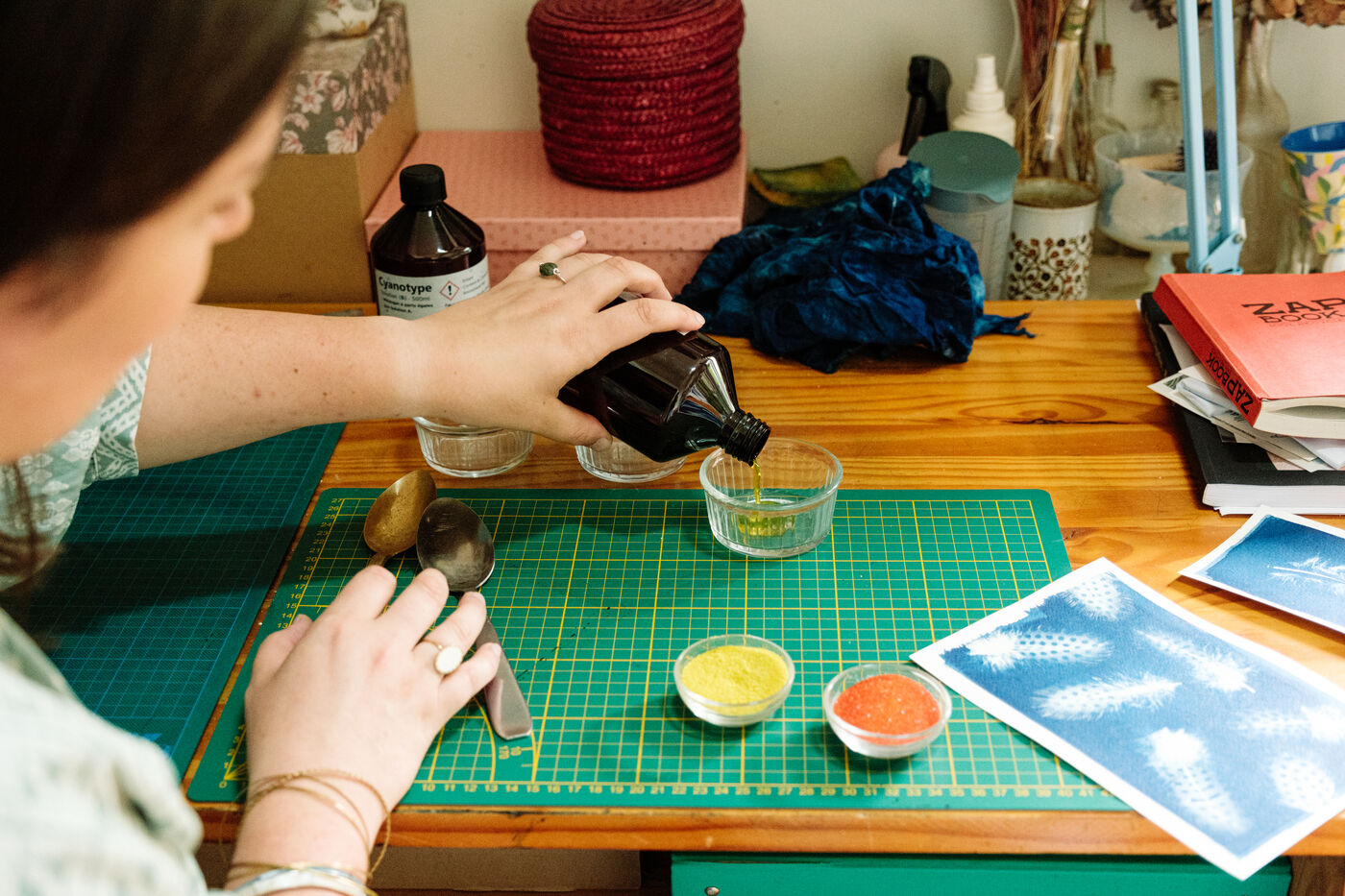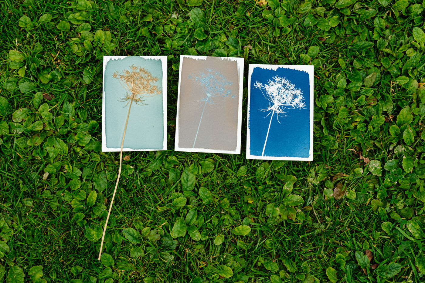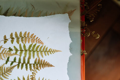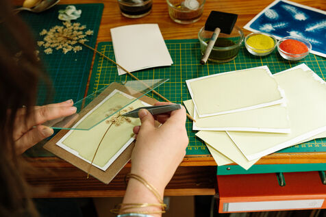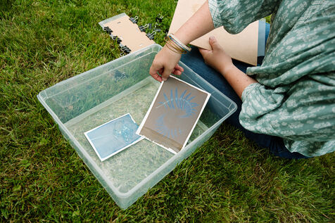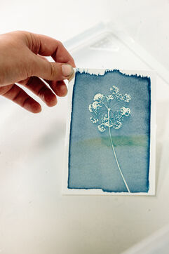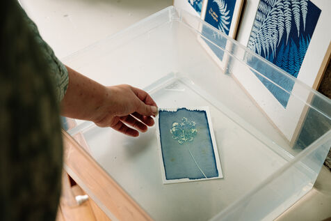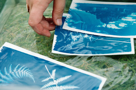 Grâce à un mélange photosensible (Citrate d'ammonium ferrique et Ferricyanure de potassium) qui est ensuite appliqué sur une surface, comme par exemple une feuille de papier, à l'aide d'un pinceau en couche homogène, Marjorie réalise des cyanotypes avec des végétaux mais également des photographies.