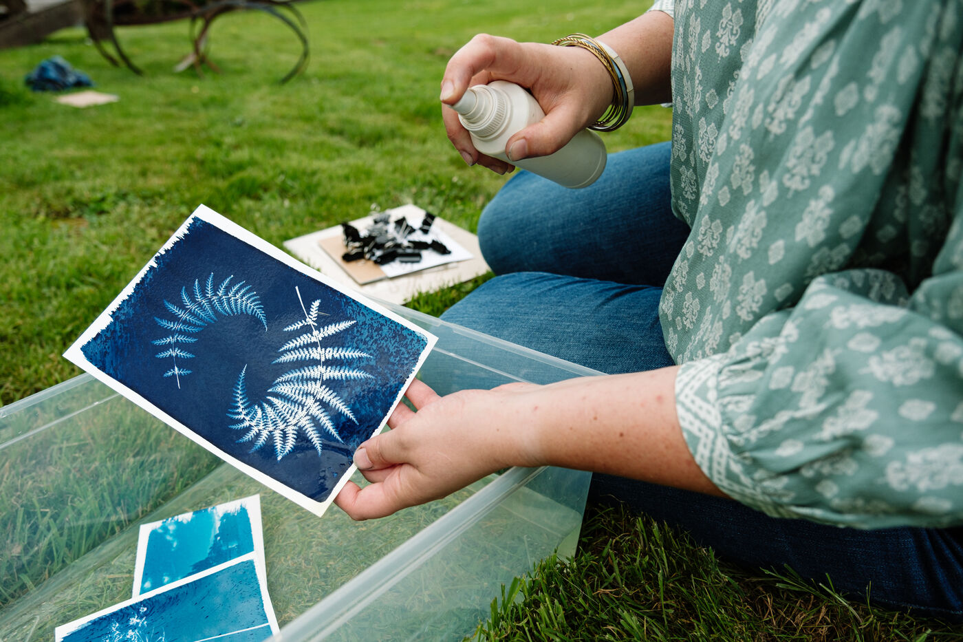 After exposure, the unreacted iron (yellow-green) is removed by rinsing with running water. The resulting cyanotype is then air-dried.