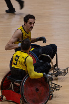 Gala wheelchair rugby match between ASM (yellow jerseys) and Bourgouin (blue jerseys) at the Gauthière stadium in Clermont Ferrand, Puy-de-Dôme, France, on November 25, 2023.