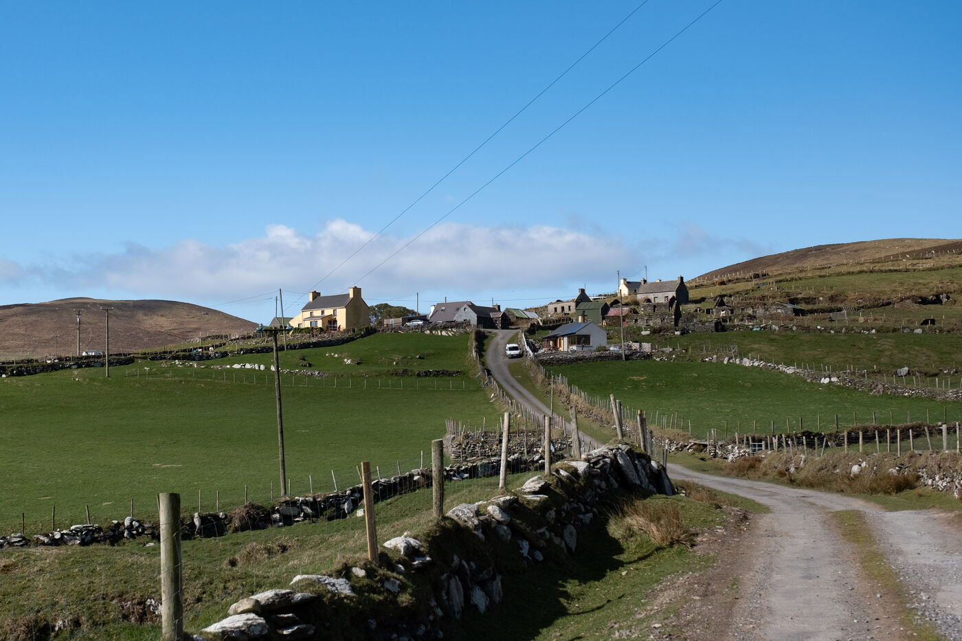Dursey Island lingers between life and abandonment. Empty roads, rusted cars, and a silent phone booth stand alongside well-kept houses — their owners unseen — while the wind carries echoes of past tragedies.