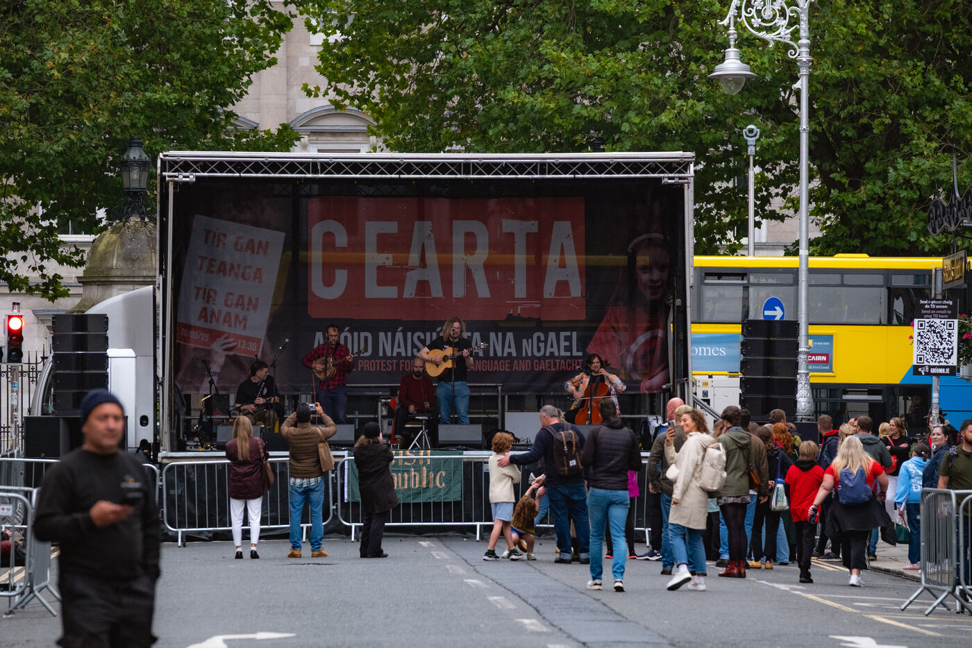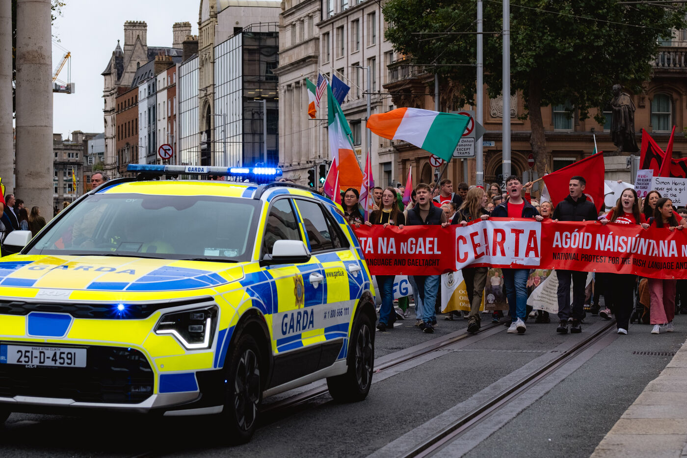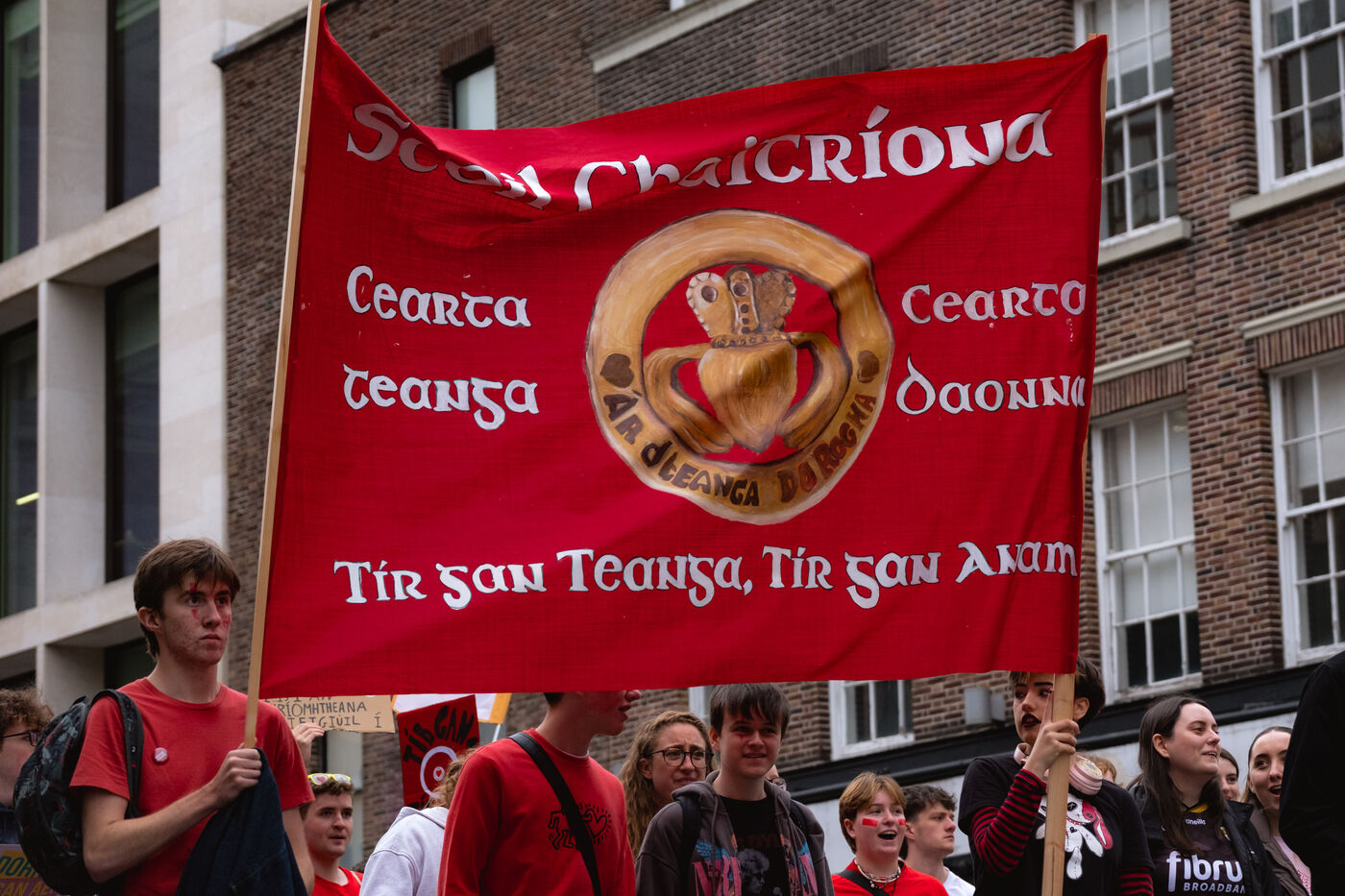 Le samedi 20 septembre 2025, des milliers de personnes ont défilé à Dublin lors de la première manifestation nationale pour la langue irlandaise et les droits du Gaeltacht (ou communauté irlandophone) depuis plus d'une décennie. Des manifestants venus de toute l'île, notamment des groupes scolaires, des organisations politiques et des communautés culturelles, se sont rassemblés de Parnell Square à Leinster House, le Parlement irlandais, vêtus de rouge, brandissant des drapeaux tricolores et scandant "Tír gan teanga, tír gan anam" ("Un pays sans langue est un pays sans âme").