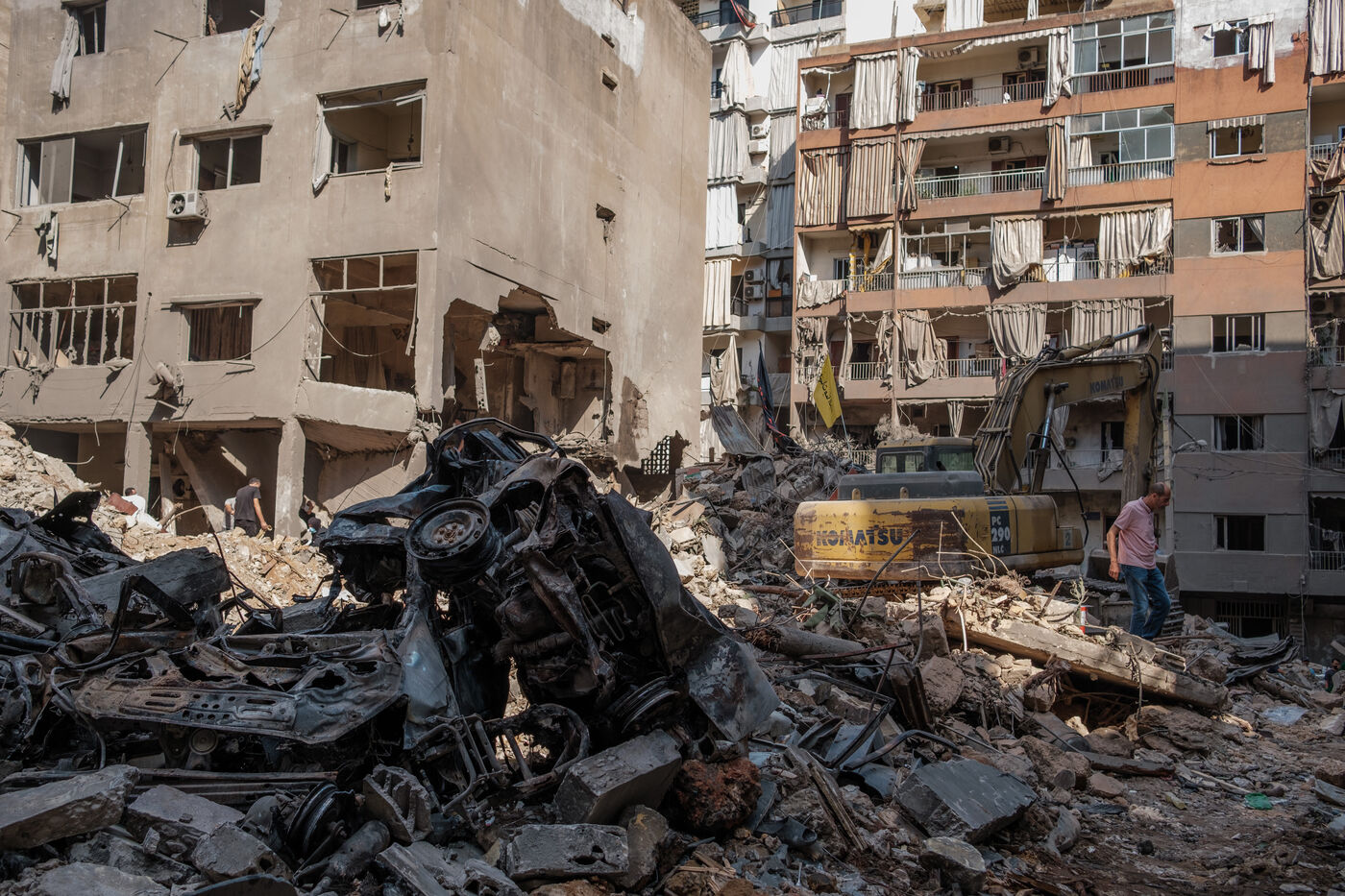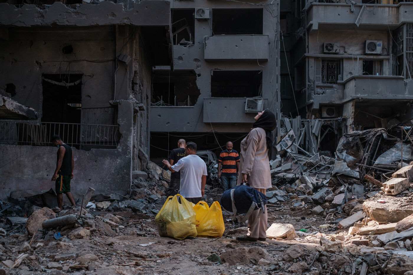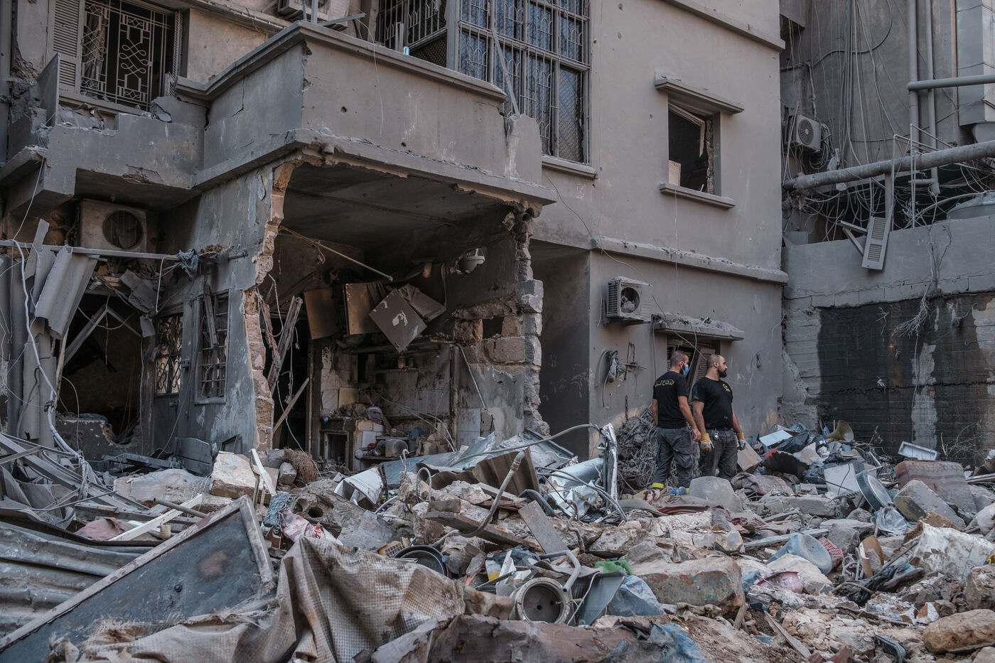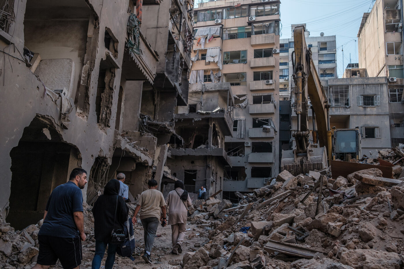 Des voisins et des habitants parcours les décombres d'un bâtiment sur le site d'une frappe israélienne qui a eu lieu sur le quartier de Basta au coeur de Beyrouth le 10 octobre 2024. Au moins 22 personnes ont été tuées lors de cette frappe, plus d’une centaine ont été blessées.