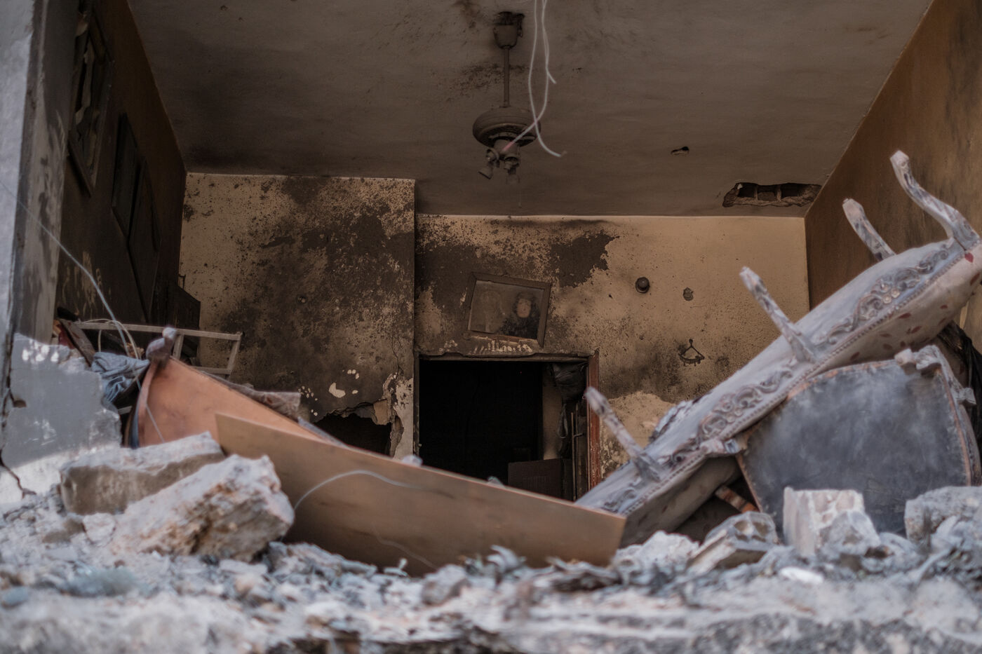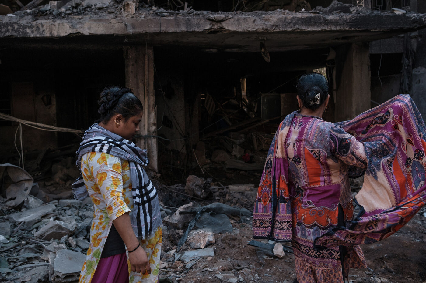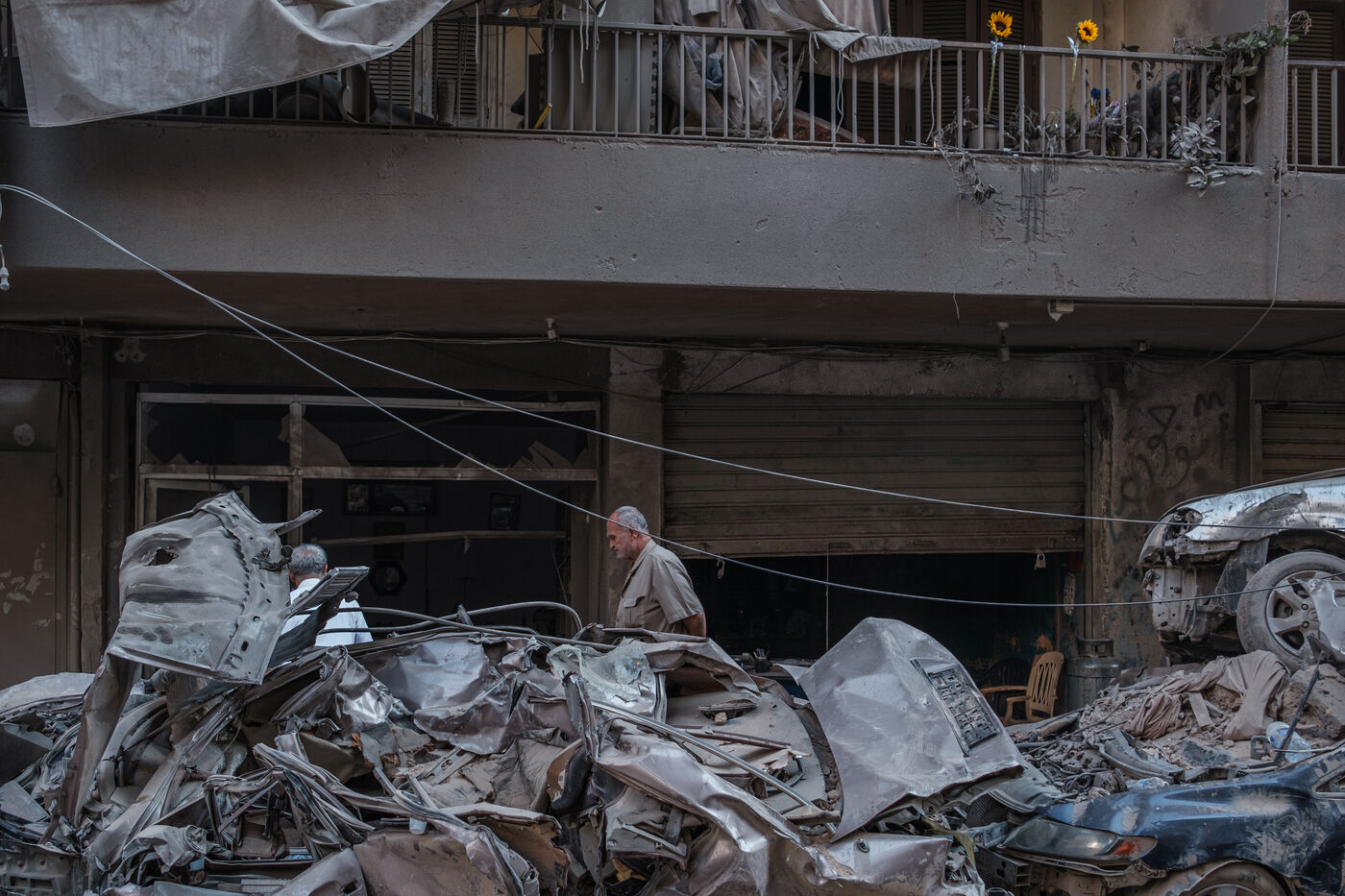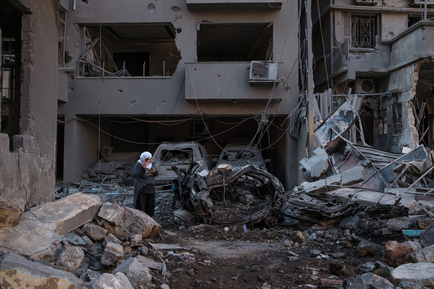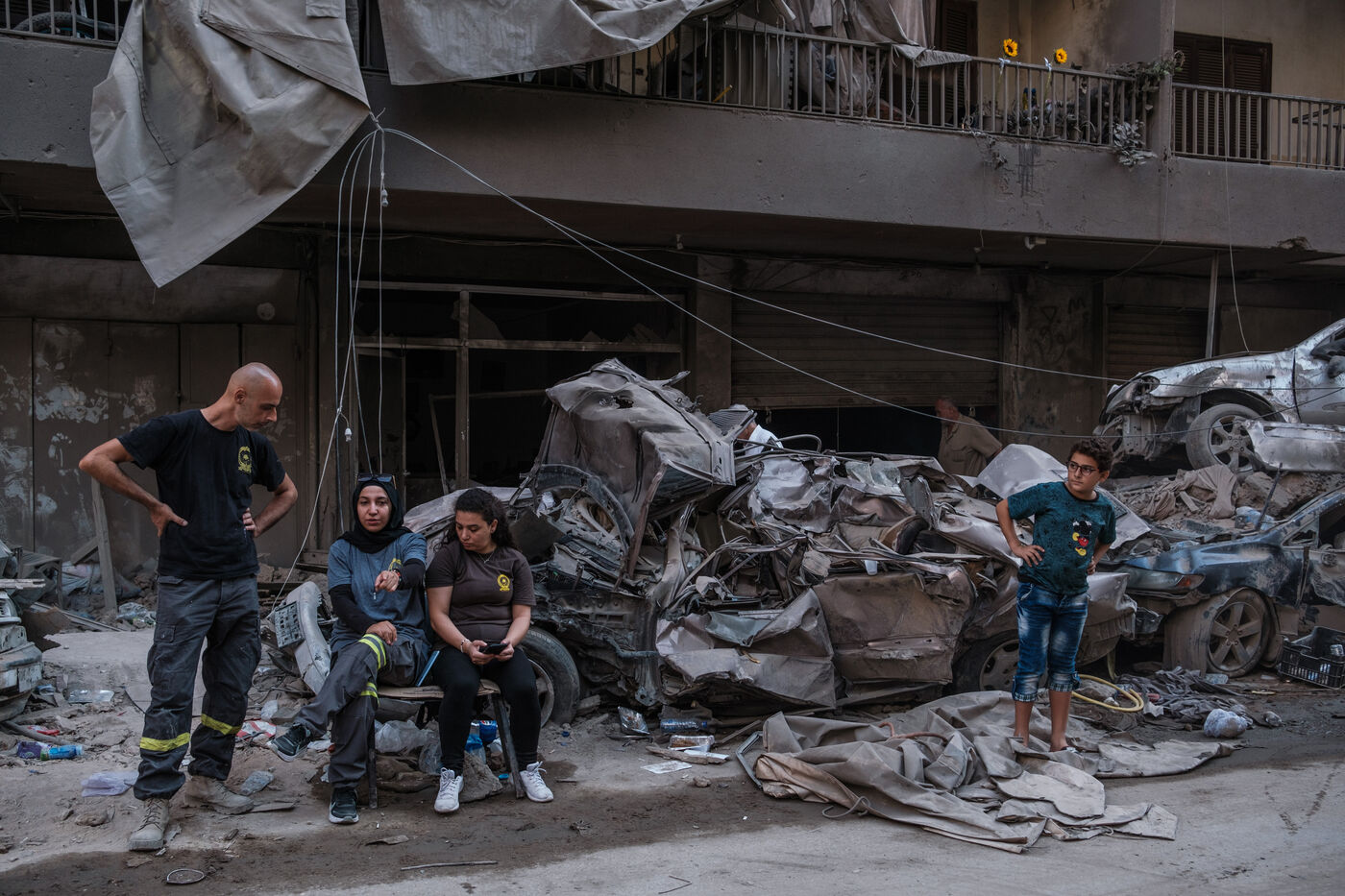 Des voisins et des habitants parcours les décombres d'un bâtiment sur le site d'une frappe israélienne qui a eu lieu sur le quartier de Basta au coeur de Beyrouth le 10 octobre 2024. Au moins 22 personnes ont été tuées lors de cette frappe, plus d’une centaine ont été blessées.