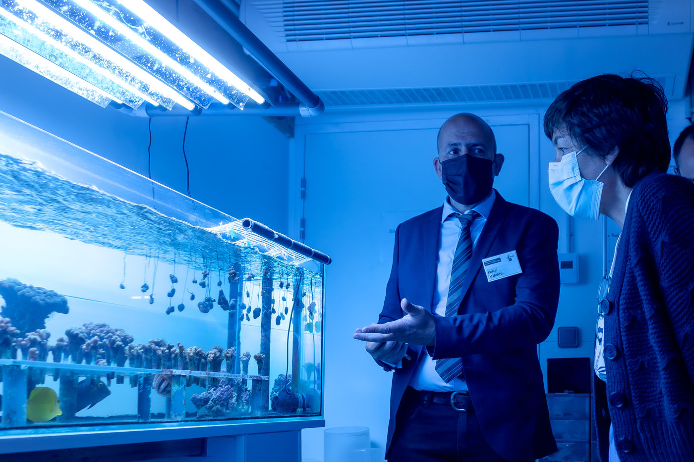 France, Banyuls-sur-Mer, 2021-05-06. Visite officielle de la Ministre de la Mer Annick Girardin au biodiversarium et au laboratoire Arago de Banyuls-sur-Mer ; des infrastructures liées a la biodiversité et aux biotechnologies marines.
