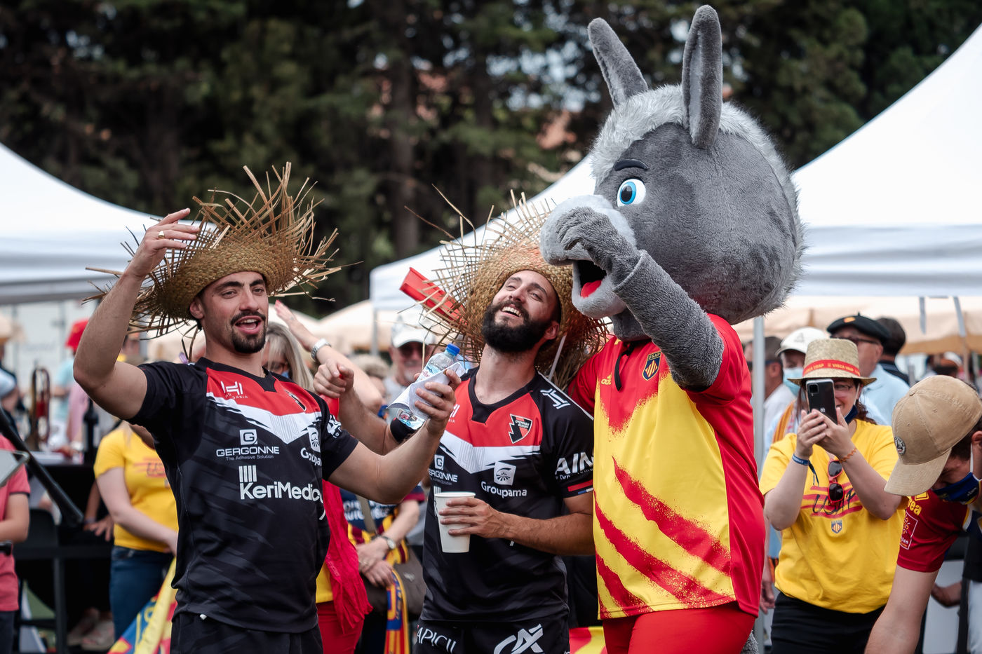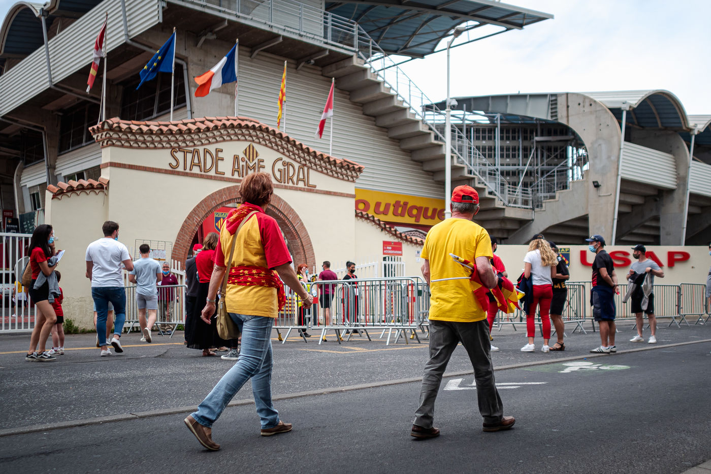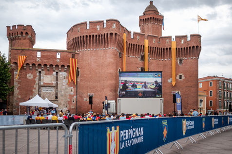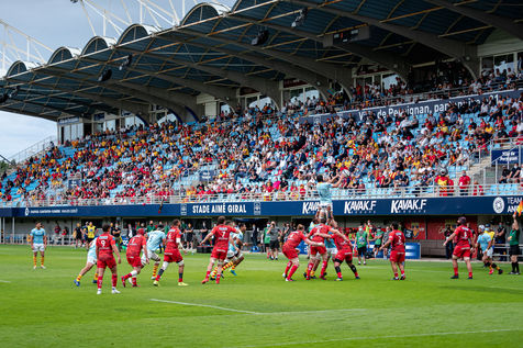 France, Perpignan, 2021-05-30. L'USAP s'impose 27-15 à Aimé Giral contre Oyonnax en demi-finale de Pro D2. Auteurs de 4 essais, les Perpignanais affronteront l'équipe de Biarritz en finale à Montpellier début juin. Ce match marquait également le retour au stade des supporters catalans avec une jauge de 1.000 personnes. Pour les fans de rugby à XV, la mairie avait installé 5 fans zones dans Perpignan avec des écrans géants.