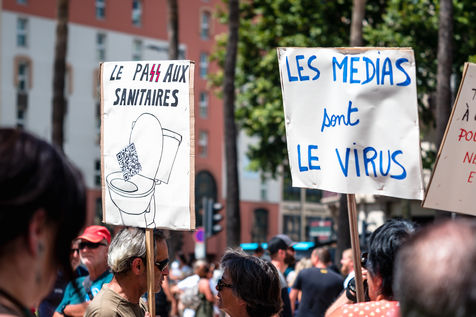 France, Perpignan, 2021-08-07. Illustration, among the anti-sanitary pass protesters, some of them gathered in front of the headquarters of the newspaper l Independant, with cries of « Collabos" or "liars". The newspaper s headquarters was smeared with swastikas, anti-media banners and yellow waistcoat posters. Photograph by Arnaud Le Vu / Hans Lucas.