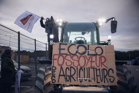 France, Perpignan, 2023-01-24. Illustration, Farmers from the Pyrenees-Orientales gathered in unions (FNSEA, Jeunes Agriculteurs) demonstrated alongside many local elected officials this Tuesday, January 24 in the streets of Perpignan. The Pyrenees-Orientales are in the front line of a historic winter drought and the restrictions are still there. For the first time, the issue lingers in the courts over a dispute between the prefecture of Perpignan, France Nature Environnement and farmers. The Administrative Court of Montpellier ruled in favor of the association France Nature Environnement on November 29, 2022. Photograph by Arnaud Le Vu / Hans Lucas.