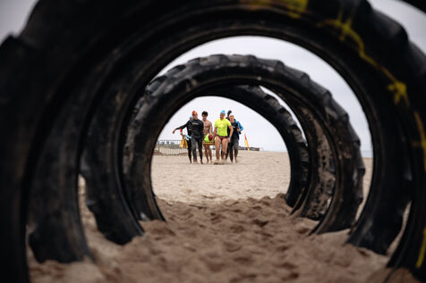 France, Argeles-sur-Mer, 2023-04-28. The candidates for the position of lifeguard on the beach of Argeles-sur-Mer participate on the last day of the course to the test of Koh-lanta to test their physical condition and their team cohesion. Photograph by Arnaud Le Vu / Hans Lucas.
