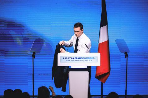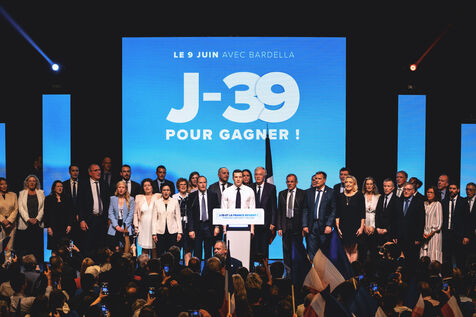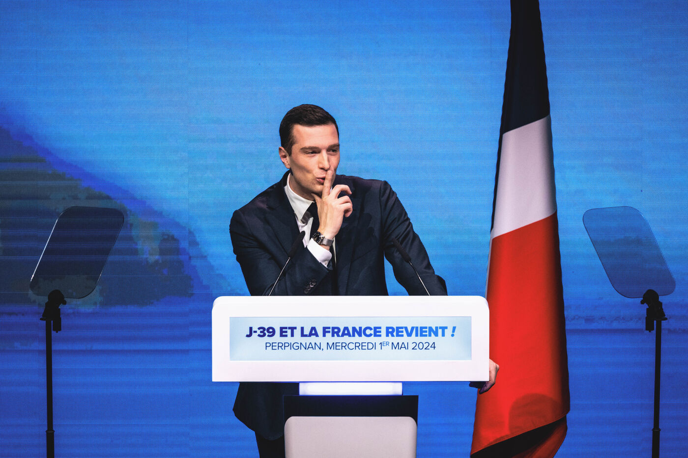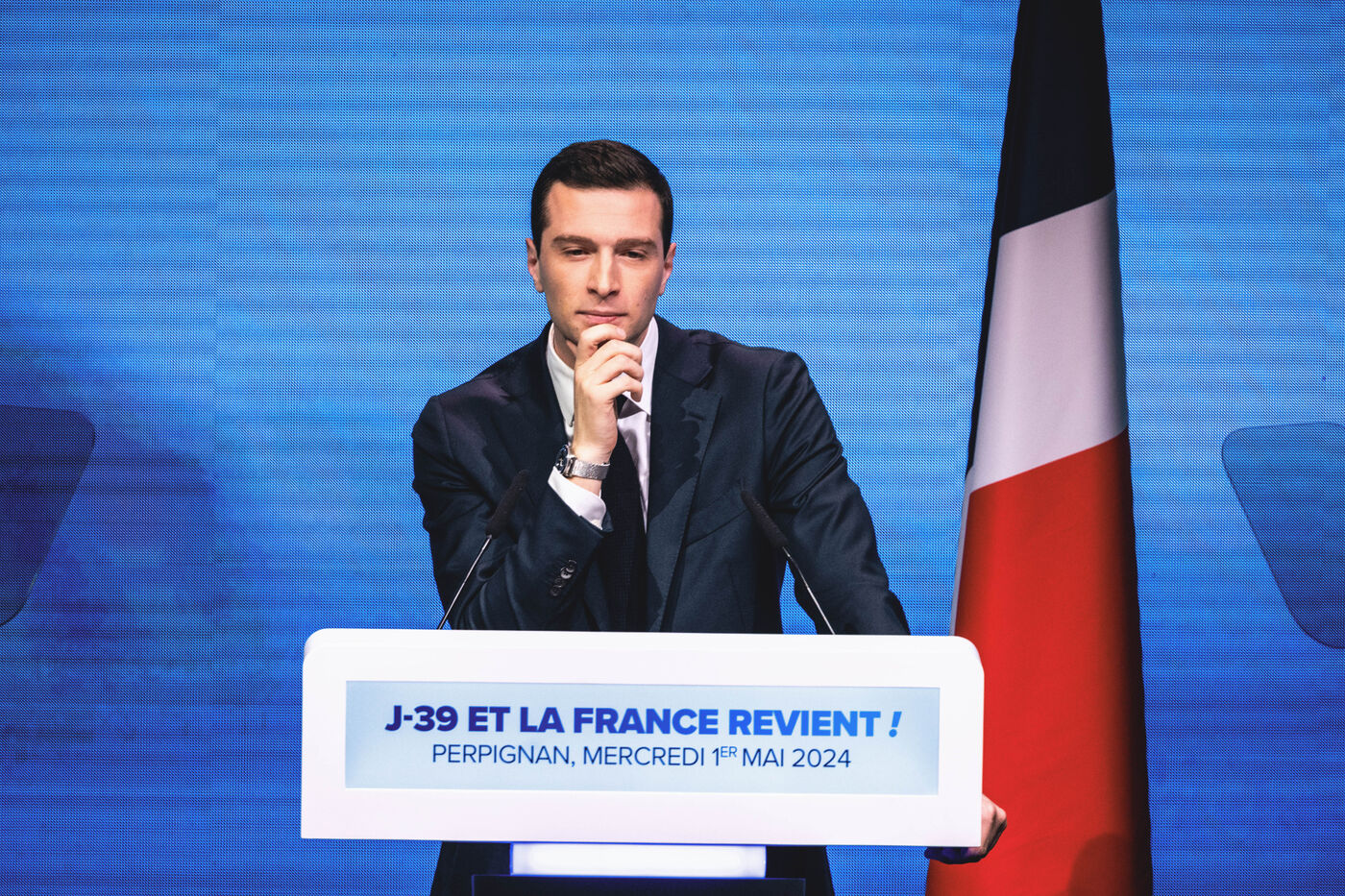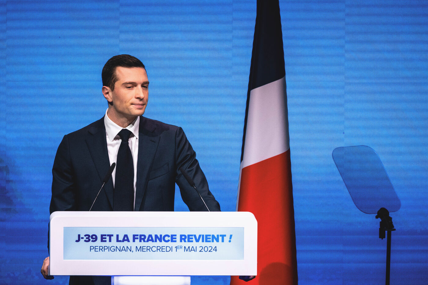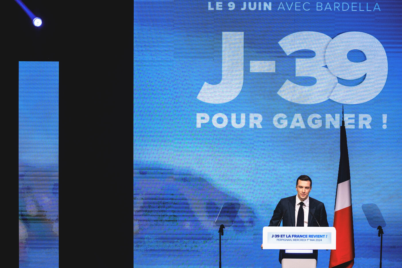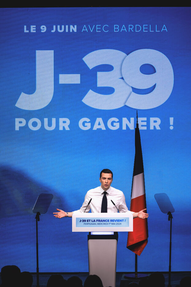 Rassemblement National meeting at the Palais des Congres in Perpignan in the French department of Pyrenees-Orientales on May 1, 2024. As part of the 2024 European elections campaign, Jordan Bardella, current Member of the European Parliament and lead candidate, unveiled his running mates.