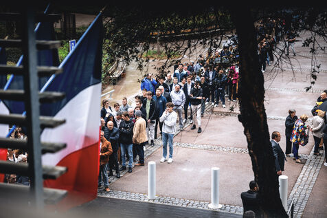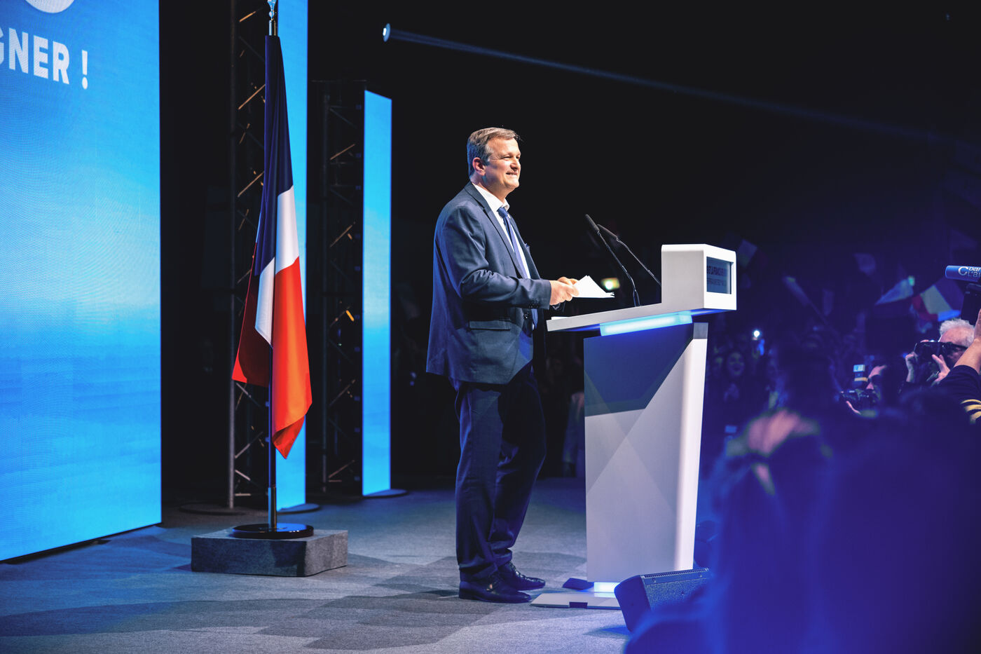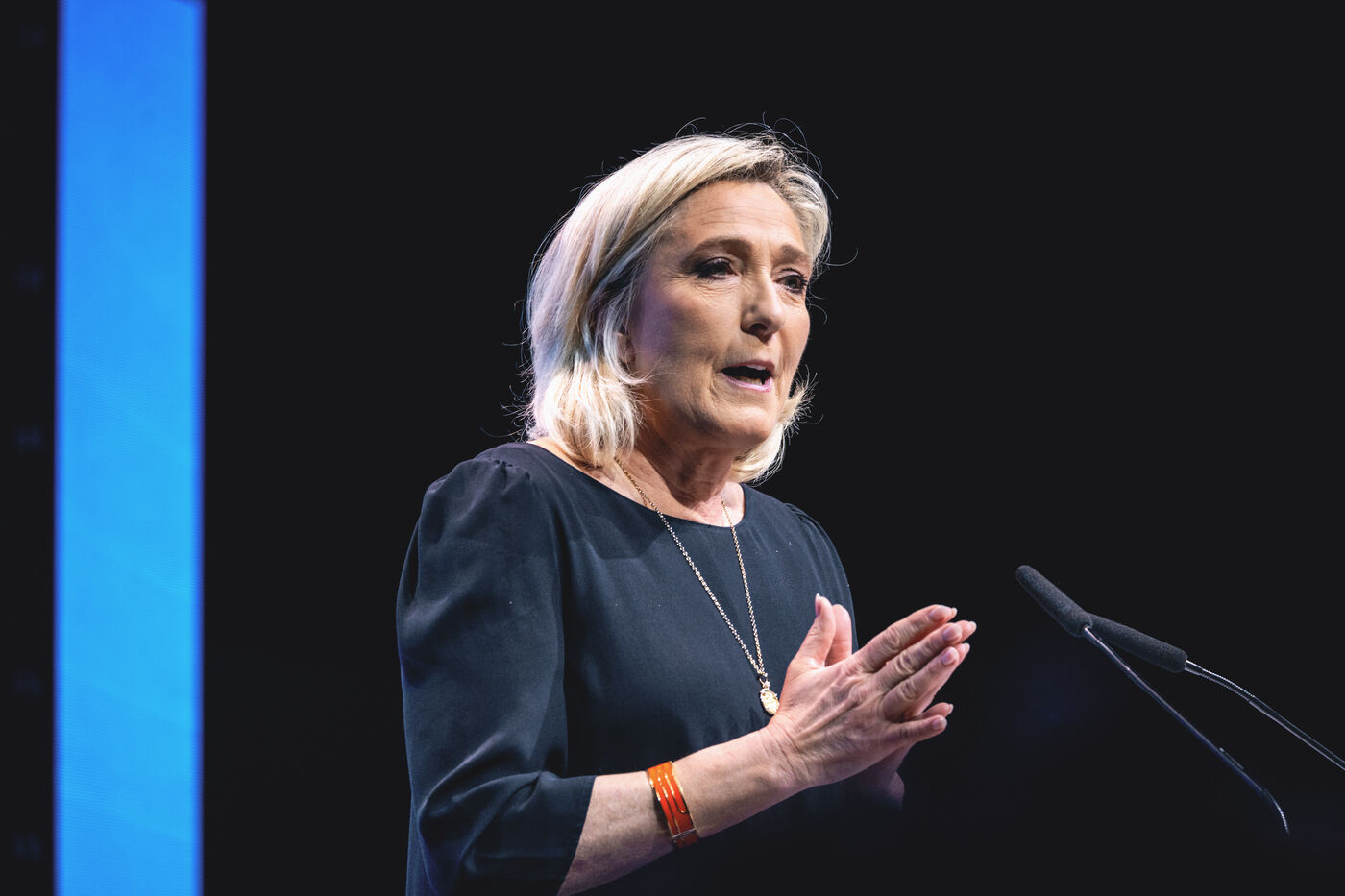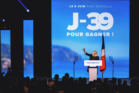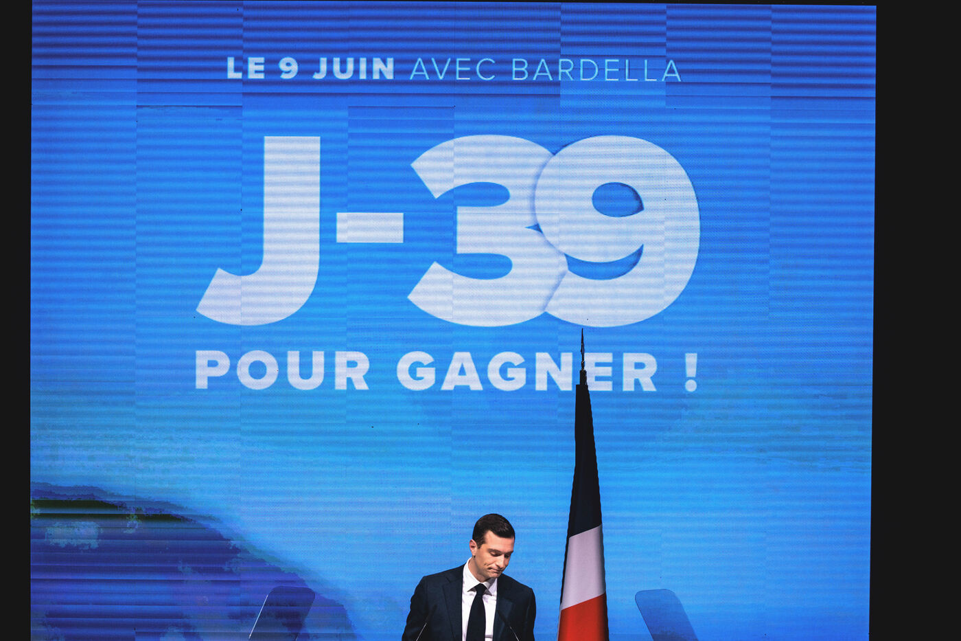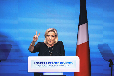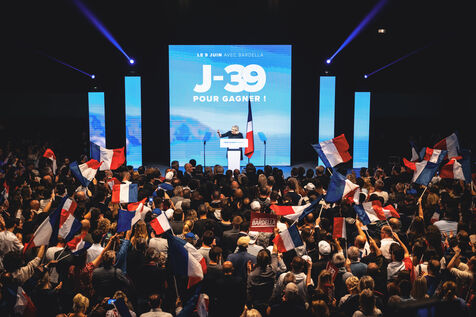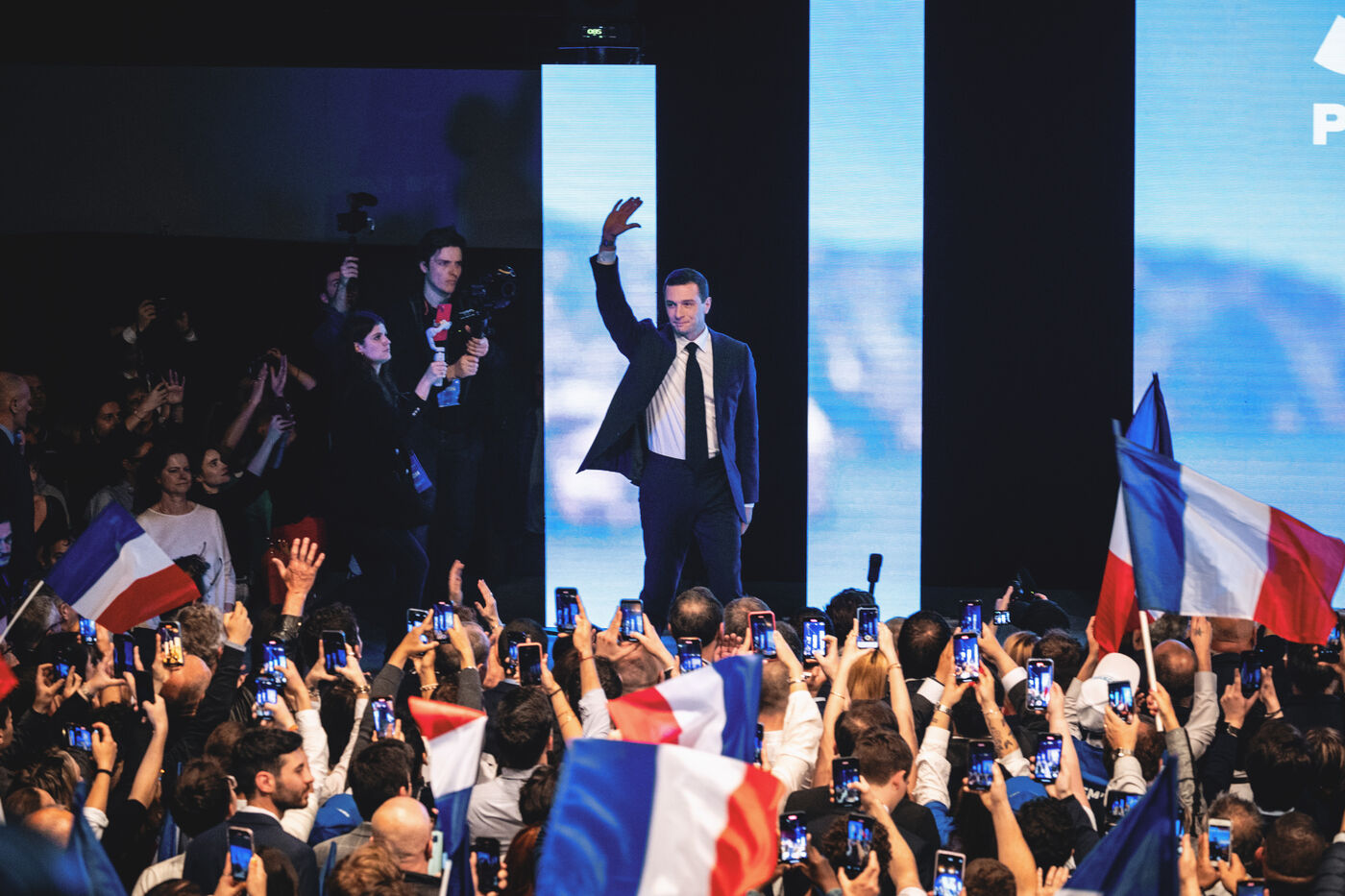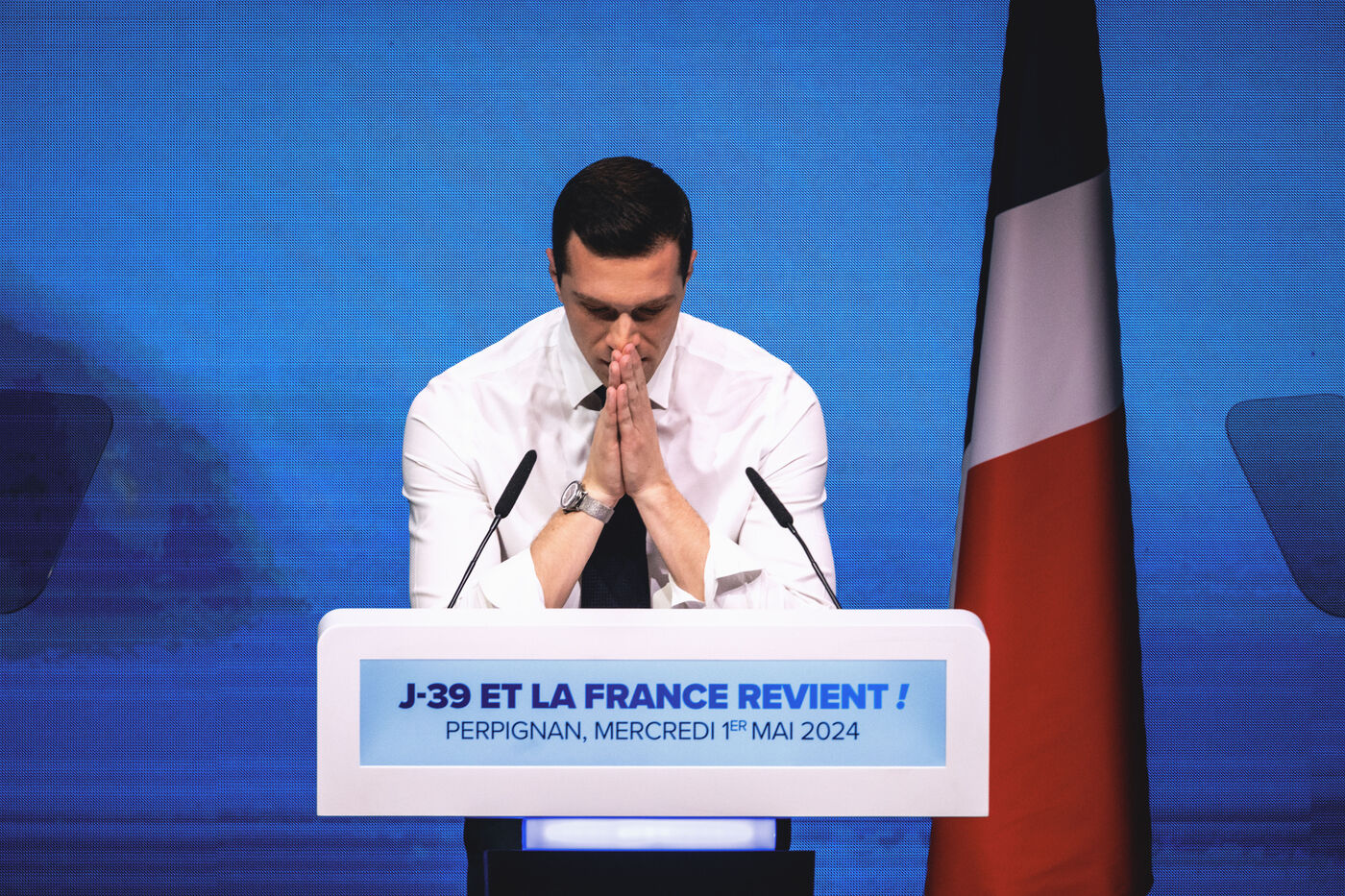 Rassemblement National meeting at the Palais des Congres in Perpignan in the French department of Pyrenees-Orientales on May 1, 2024. As part of the 2024 European elections campaign, Jordan Bardella, current Member of the European Parliament and lead candidate, unveiled his running mates.
