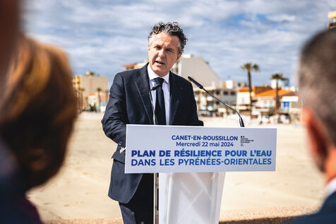Déplacement du ministre Christophe Béchu à Canet-en-Roussillon dans le département français des Pyrénées-Orientales le 22 mai 2024. Christophe Béchu a présenté son Plan de résilience pour l'eau, qui se compose de sept projets structurants, et a annoncé une enveloppe de 10 millions d'euros pour le département.
