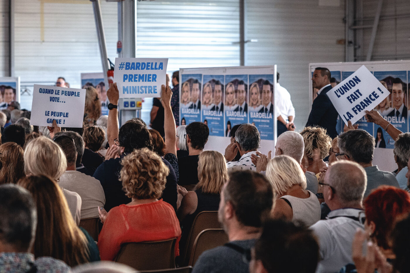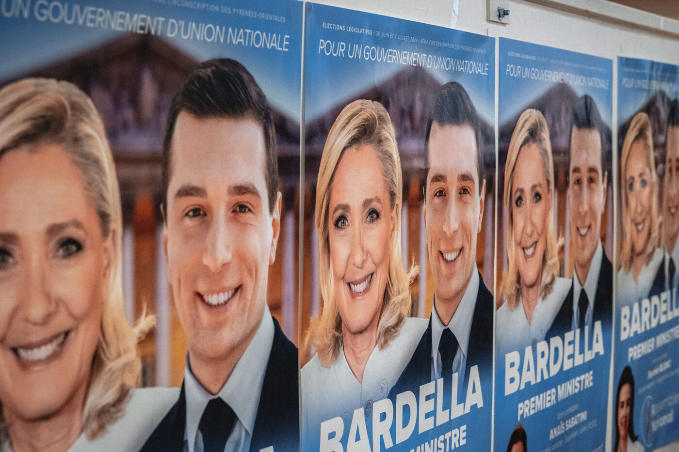 A Rassemblement National meeting at the Espace Saint Mamet in Saint Esteve in the Pyrenees-Orientales department of France on July 3, 2024. The outgoing deputies and party elected officials in the department motivated members for the final stretch before the second round of legislative elections.