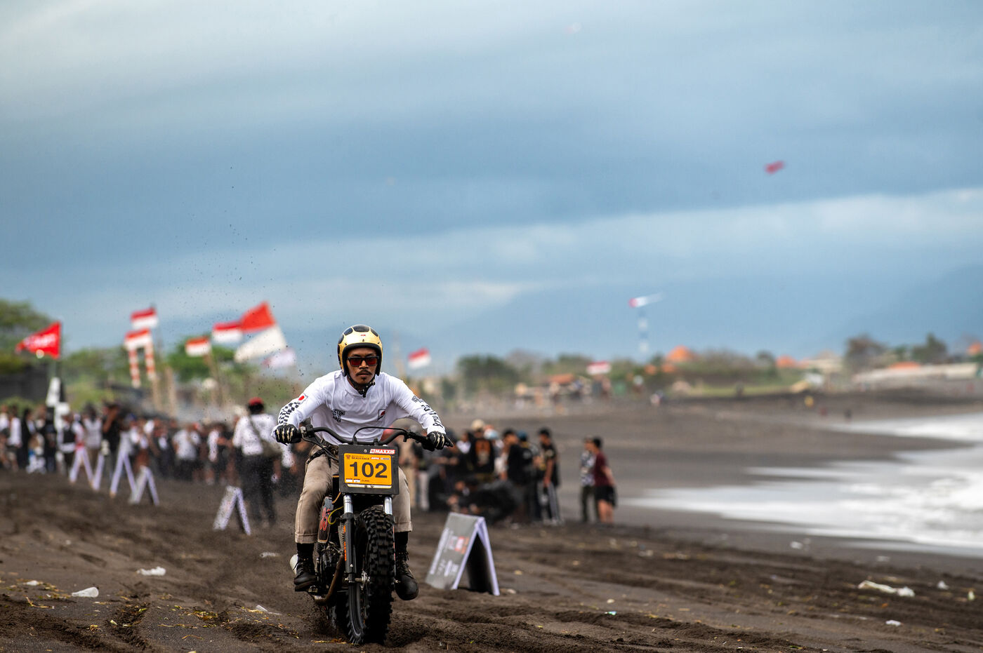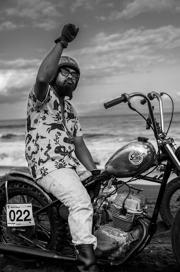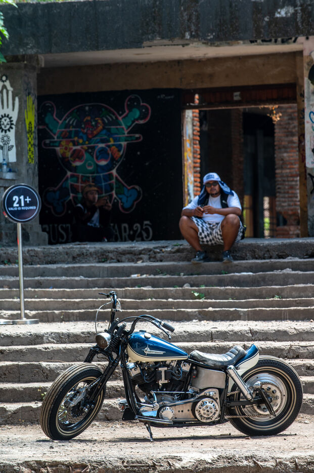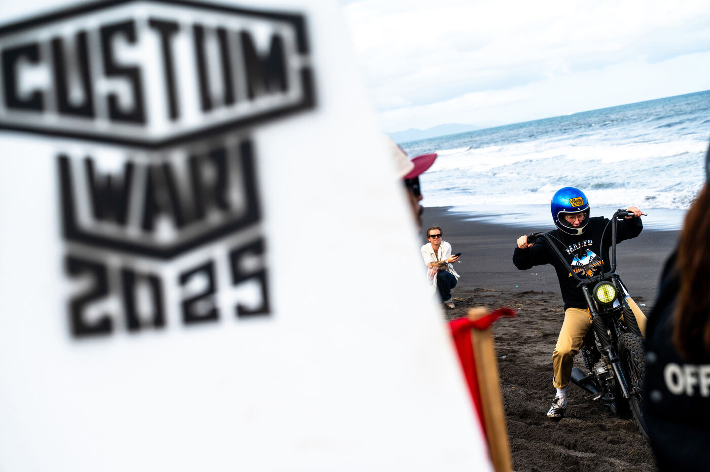 Installé dans un cadre underground, entre temple végétalisé et bunker à ciel ouvert intégralement tagués pour l’occasion par une multitude d’artistes aux slogans, comme un cri sur les murs : « CUSTOM WAR !!! ». La guerre du custom est déclarée. À quelques mètres, une plage au sable noir comme le fuel, transformée en piste sauvage, accueille la beach race : courses survoltées où les pneus crissent sur le sable brûlant, les moteurs hurlent, des HD tackées das le sable, et la mer, en toile de fond, se couvre d’étincelles d’écume. Courses folles : les runs s’enchaînent au milieu d’une foule de plus en plus dense. Entre sérieux et éclats de rires, les garages se livrent une guerre sans nom, du debut de l’après-midi jusqu’à la nuit tombée. Ici, le Sunset prend une nouvelle teinte – punk, brut et racé.