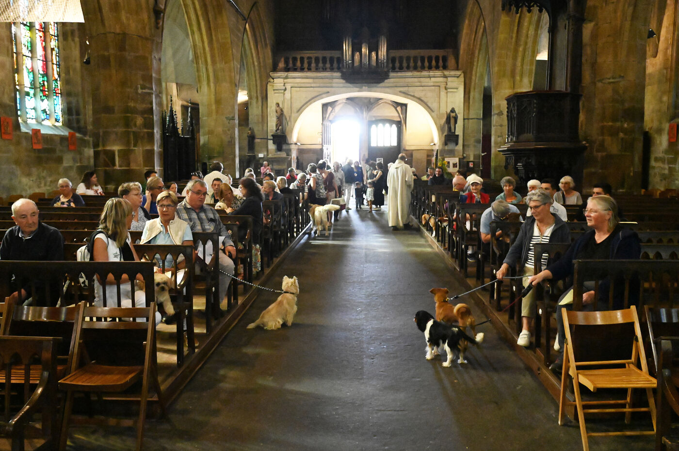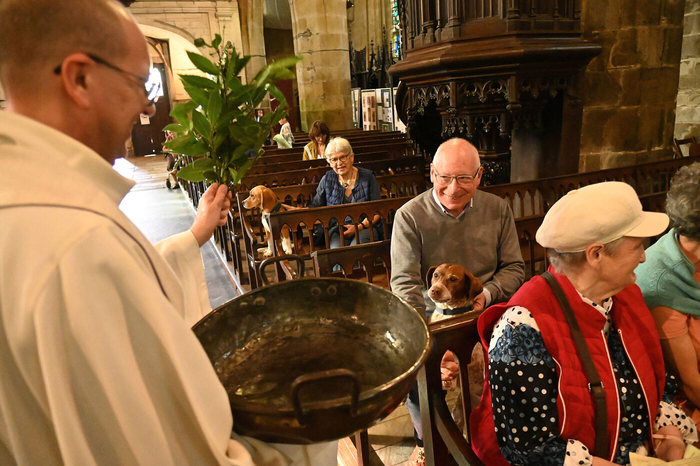 As in previous years, a story will undoubtedly appear in local newspapers inviting the faithful to come in large numbers to the Notre-Dame-de-Paradis basilica, in Hennebont, on the Sunday following World Animal Day on October 4, to bless their domestic animals. On this special day, the church is transformed into a true Noah's Ark : dogs sitting quietly on the knees of their mistresses, peaceful labradors, curious beagles, fearful cats curled up at the bottom of their boxes! At 4 p.m., the service begins in an atmosphere that is unusual to say the least. Humans sing, animals live their lives, climb on the benches, scatter in the aisles. “Animals participate in the lives of men,” says the priest of Hennebont. For some owners, their pet will be the only company of the day. There is solidarity between all creatures because they all have the same Creator and all are ordered to his glory. By blessing the animals,we give thanks to God.” Leaving the microphone, he grabs a large copper basin filled with holy water and, with a branch, begins his blessing by sprinkling masters and animals. “In sixteen years, I have had goats, snails, hamsters, rabbits and even horses !” Ronan Graziana's eyes shine behind his thin glasses. “I live surrounded by animals, especially birds. I run an ornithology club. Birds are my passion.” In the presbytery garden live alpacas, goats, turkeys, pheasants, Asian ducks and some other exotic birds including parrots.