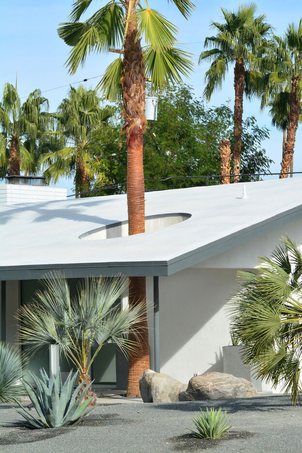 De West Cielo Road, la vue sur la ville de Palm Spring est de toute beauté. Une mer de palmiers crée la réalité d’une oasis qui s’étend loin dans le désert. Le paysagiste Paul Ortega travaille ici sur le jardin d’une maison des années 50, blanche, aux lignes épurées se perdant dans les rochers.