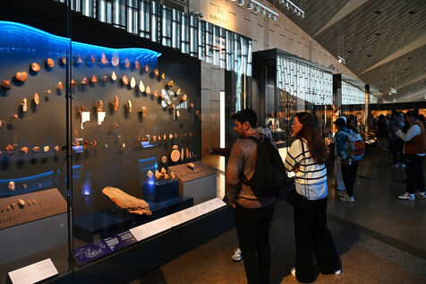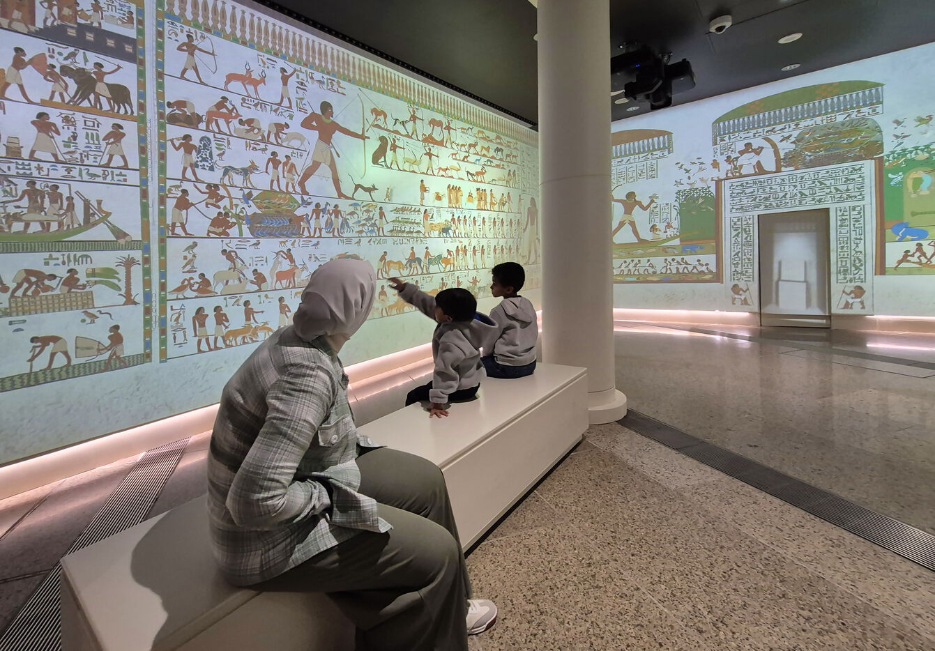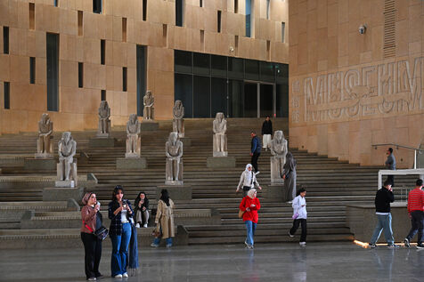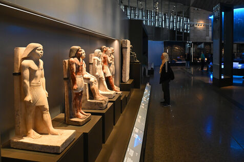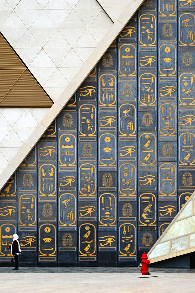 At the top of the grand staircase, a large bay window allows you to admire the pyramids of Giza, located less than three kilometers from the museum. In order not to obscure their view, the Grand Museum, designed by the Heneghan-Peng architectural firm, is located below the pyramids. The cost of the work, estimated at $550 million, ultimately exceeded $1 billion. The museum is designed to make the link between the Nile, symbol of life and fertility, and the Giza plateau, place of residence of the deads. Oriented towards the pyramids, it takes their triangle shape as shown in with the main entrance decorated with 25 cartridges representing the names of the 25 pharaohs of Egypt.