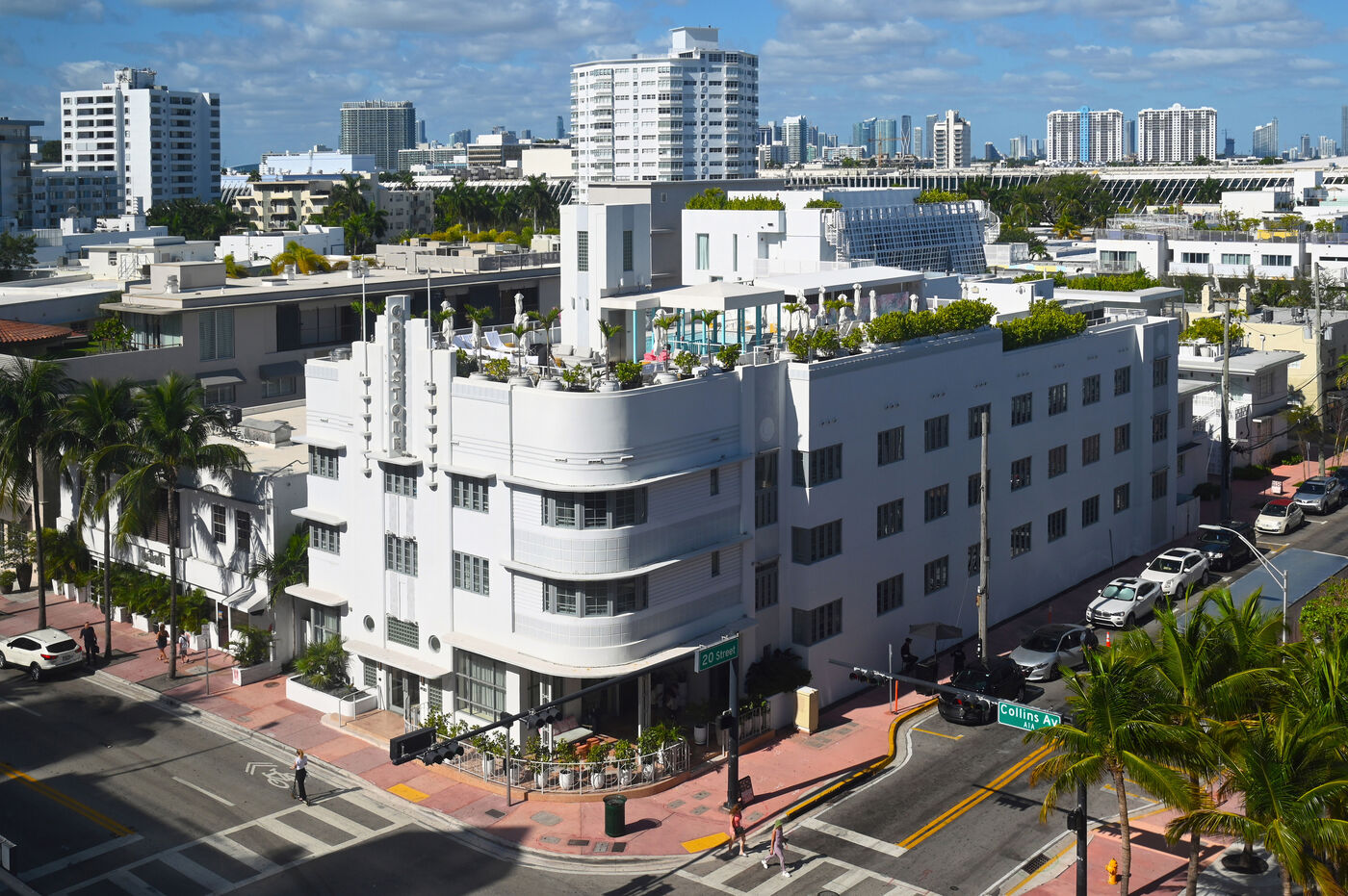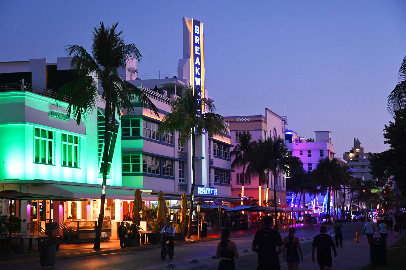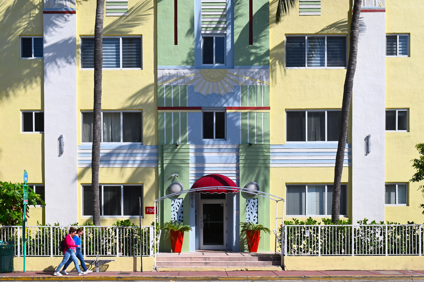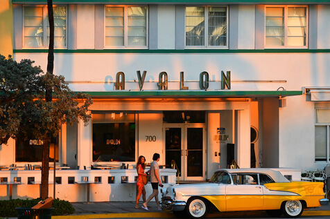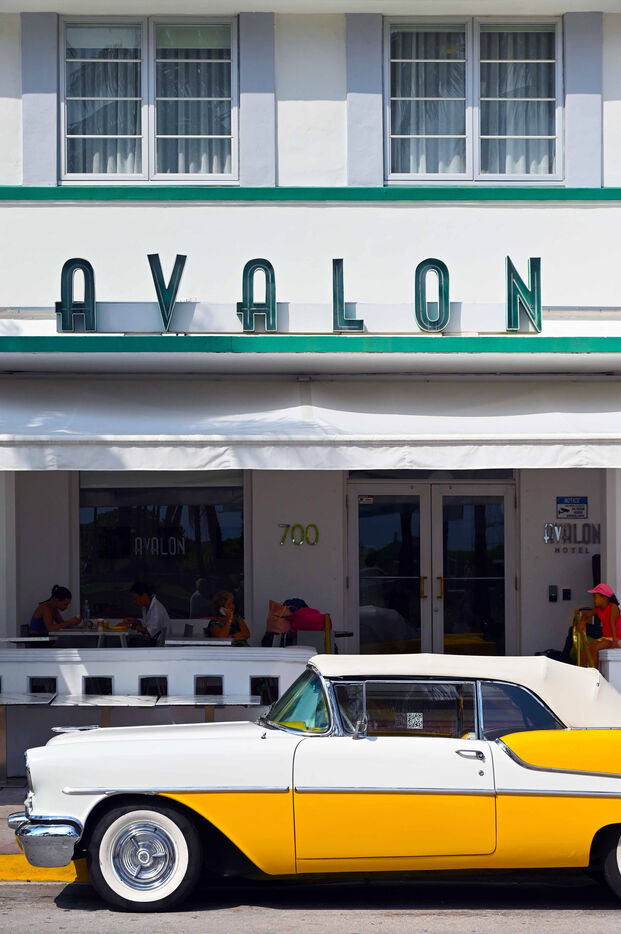 Il est encore tôt sur Ocean Drive. Le soleil vient de se lever, la plage est quasi déserte malgré une mer translucide et calme propice à la baignade. Roy, guide bénévole, a donné rendez-vous à une poignée de passionnés d’architecture devant l’Art Deco Welcome Center, situé au carrefour de la 10e Rue. Le tour débute par une longue déambulation le long d’Océan Drive. Là, sur à peine un kilomètre de long, se succèdent des façades d’immeubles aux formes géométriques, aux lignes pures, à la décoration fleurie et aux couleurs pastel. Tous sont d’anciens hôtels construits au lendemain du cyclone de 1926 qui détruisit la ville. Le style en vogue alors est l’Art Déco et les architectes en profitent, créant en quelques années un lieu qui deviendra bientôt mythique, où stars et crooners viendront faire la fête sous le soleil et les cocotiers à bord de ces belles voitures américaines dont quelques unes se prélassent encore devant certains hôtels.