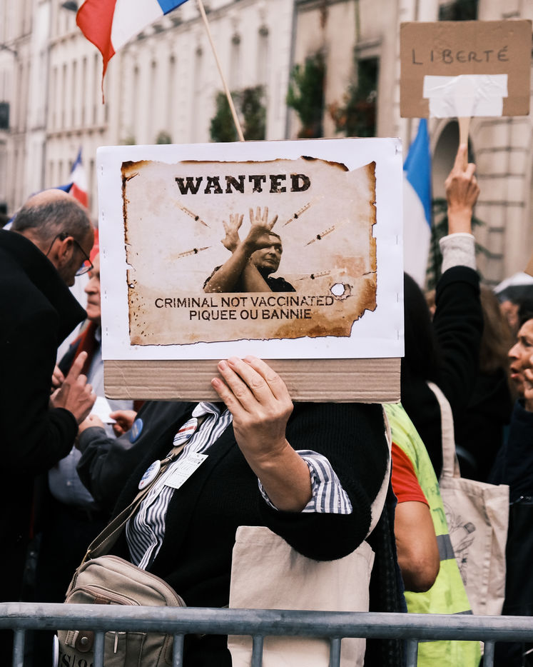 Manifestation contre la loi sur l'obligation vaccinale à Paris. À l'appel de Florian Philippot, fondateur du mouvement d'extrême droite "les Patriotes", la manifestation prend place devant le Sénat, à la veille de l'étude du texte de loi au Conseil des ministres.