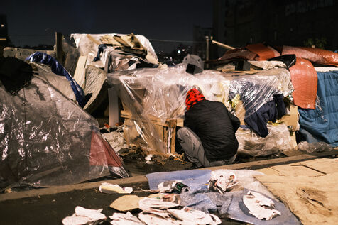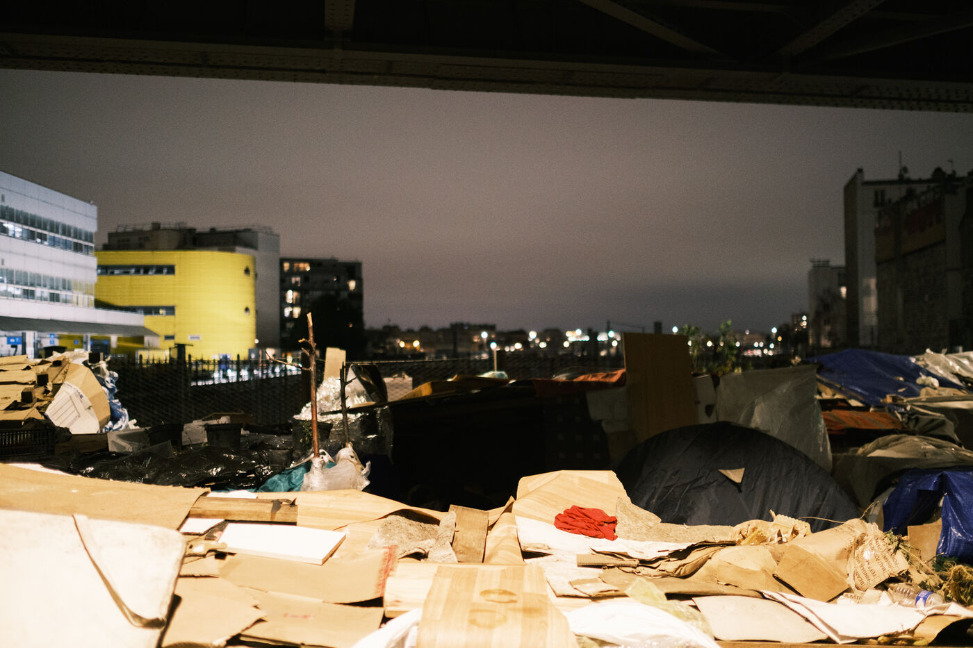Près de 300 hommes exilés survivent sur le campement des anciens jardins partagés dans le quartier de La Chapelle, sous le métro aérien.