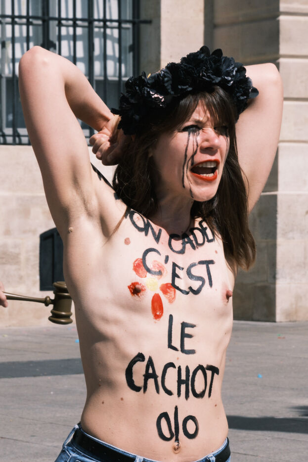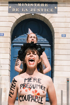 Action by the Femen feminist collective in front of the Ministry of Justice on Mother's Day, to denounce the justice system's inaction on domestic violence and support the protective mothers incarcerated for wanting to protect their children from a violent father.