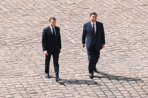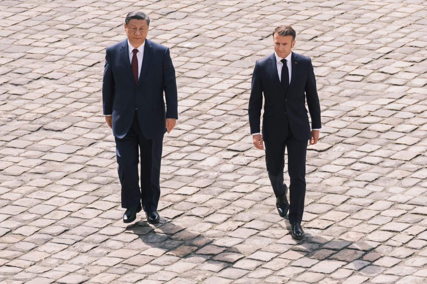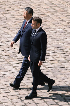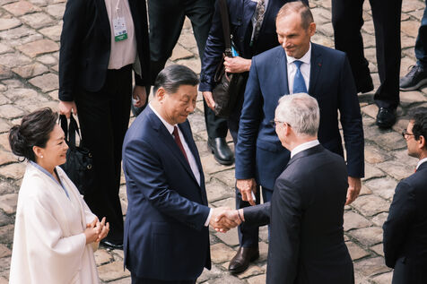 President Emmanuel Macron welcomes Xi Jinping, President of the People's Republic of China, on his official visit to France, at a welcoming ceremony in the courtyard of the Hôtel National des Invalides.