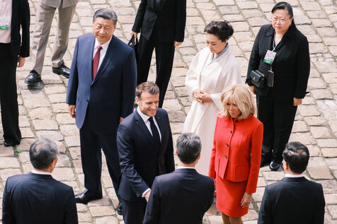 Le Président Emmanuel Macron reçoit le Président de la République populaire de Chine Xi Jinping pour sa visite officielle en France, lors d'une cérémonie d'accueil dans la cour de l'Hôtel national des Invalides.