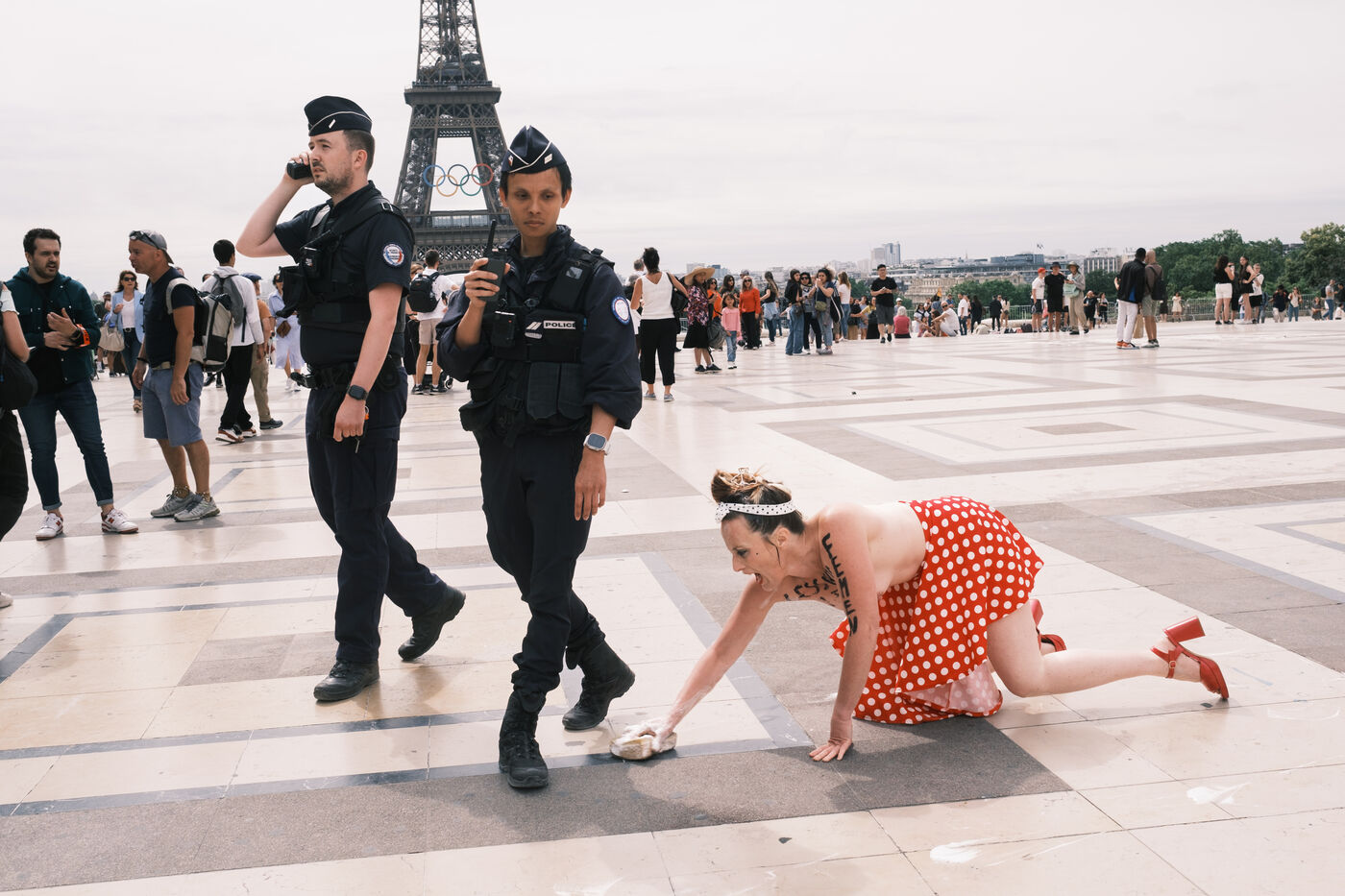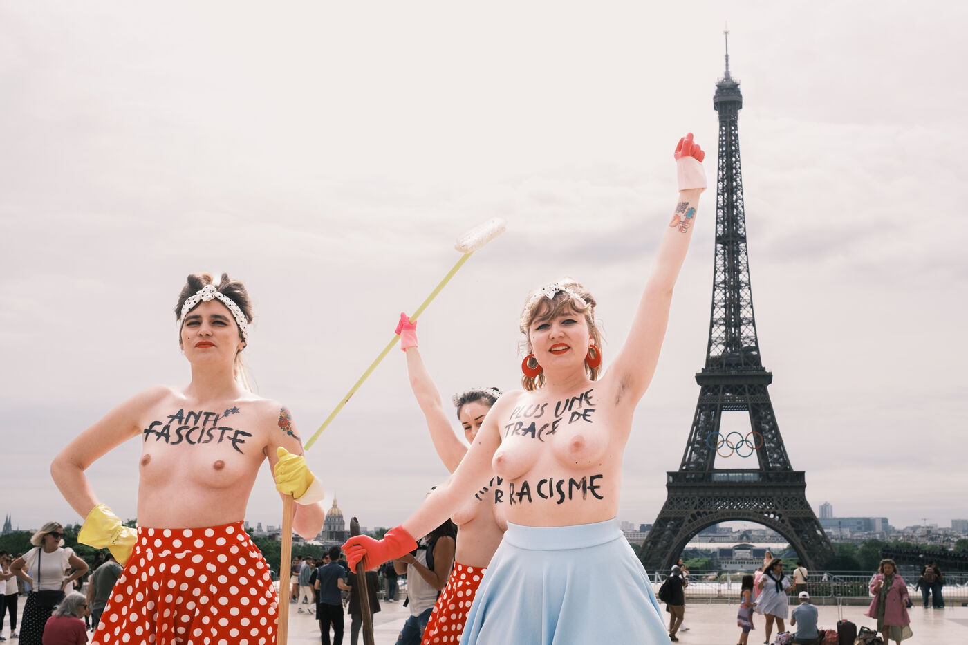 Action by the Femen feminist collective, to call for a barrage against the extreme right, on the eve of the legislative elections. On the parvis des Droits de l'Homme, the activists staged an "anti-fascist cleansing against the RN".