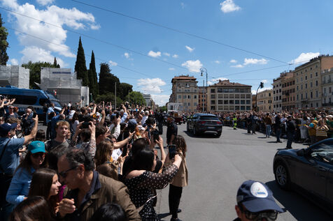 The papamoblie with the coffin of Pope Francis passes in front of the Coliseum. Hundreds of faithful and tourists bid him a final farewell.