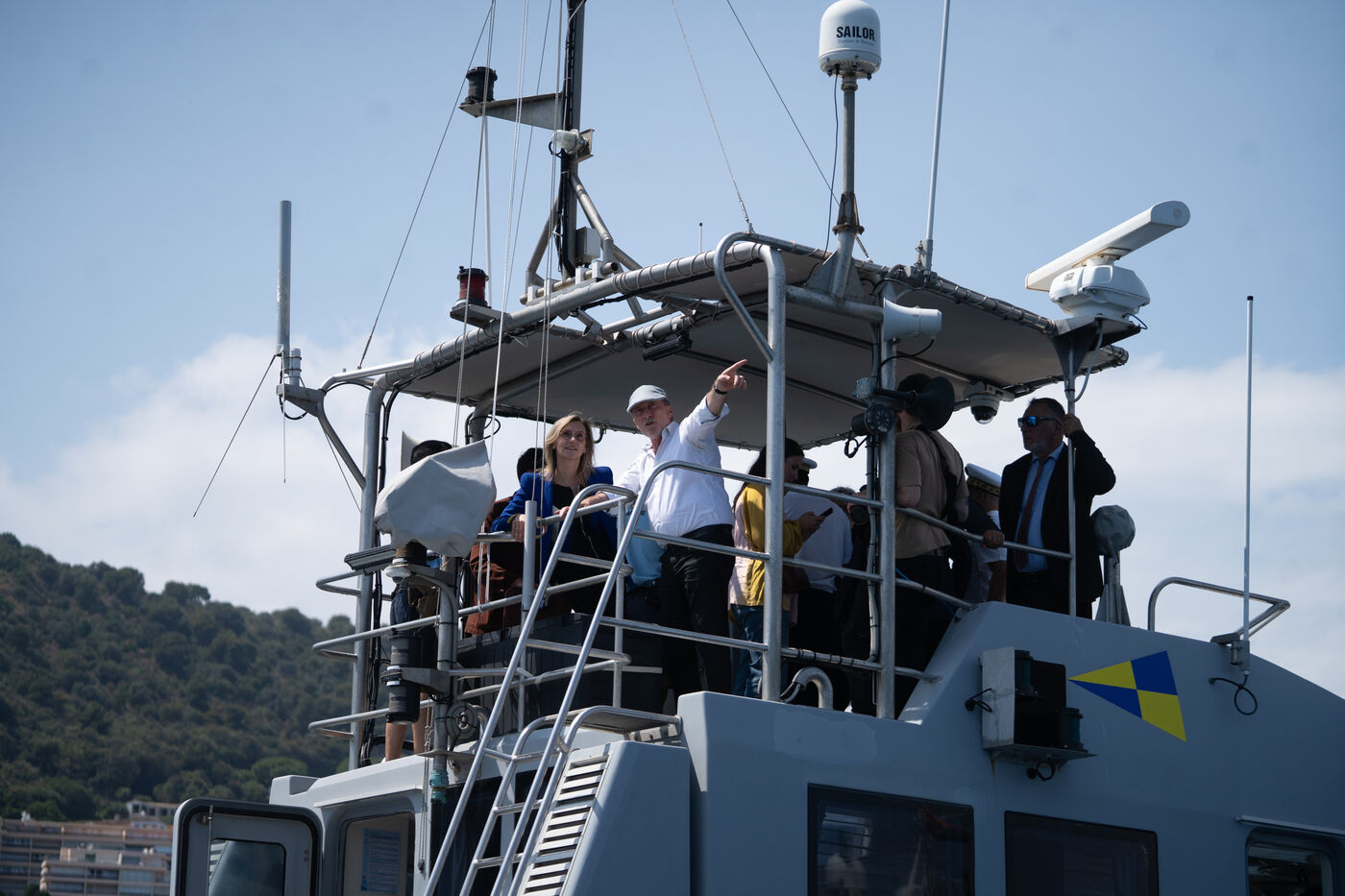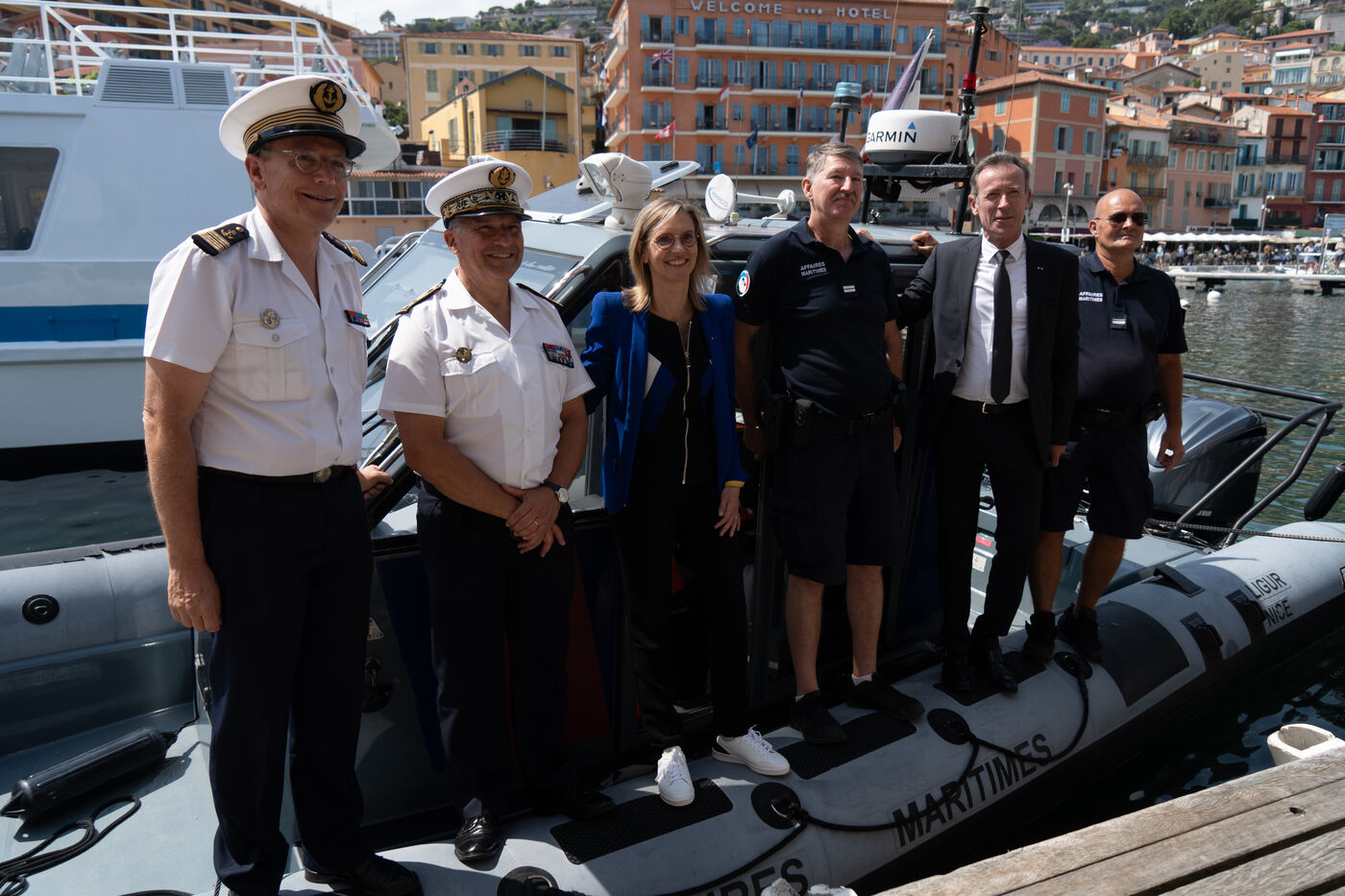 Visite à Villefranche-Sur-Mer de la Ministre de la transition écologique Agnes Pannier Runacher. Expositions du dispositif de sécurité et des installations maritimes.